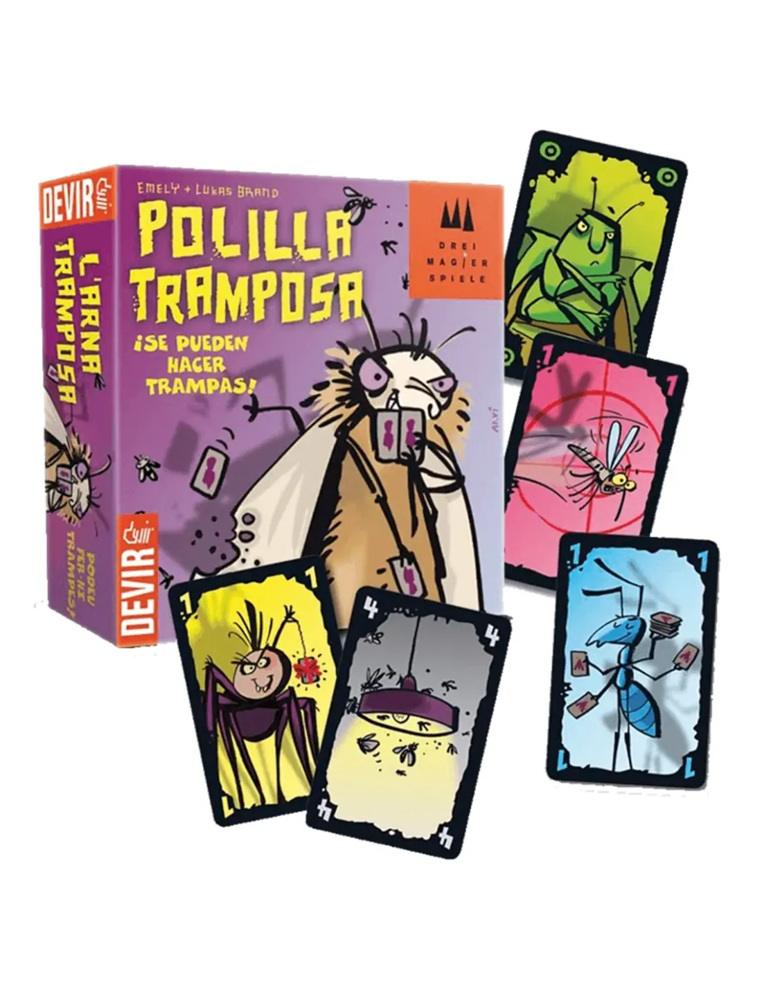 Características del Juego de Mesa Devir La Polilla TramposaEl juego de mesa La Polilla Tramposa de Devir es una propuesta divertida, original y perfecta para niños a partir de 7 años y familias que buscan risas garantizadas. Galardonado con el Deutscher Spiele Preis al Mejor Juego Infantil, rompe con las reglas tradicionales: aquí hacer trampas no solo está permitido... ¡es parte del juego! Una mecánica única y muy dinámica que fomenta la interacción y la picardía entre jugadores.Trampas permitidas: ¡esa es la gracia!En La Polilla Tramposa, cada jugador debe deshacerse de sus cartas lo más rápido posible. Pero no todas se pueden jugar de forma normal: algunas cartas solo se pueden eliminar haciendo trampas sin ser descubiertos por el jugador vigilante, que hará de "chinche guardián". Esto da lugar a situaciones hilarantes y pone a prueba la astucia de los participantes.Recomendado a partir de 7 añosEntre 3 y 5 jugadoresPartidas de unos 20 minutosComponentes y edición multilingüeEl juego incluye un mazo con 72 cartas de acción con ilustraciones coloridas y reglas en castellano, catalán y portugués. Ideal para compartir con niños, amigos o como regalo creativo. Todo en un formato compacto, perfecto para llevar a cualquier reunión o viaje.Incluye 72 cartasInstrucciones en tres idiomasPublicado por Devir en 2012Otras especificacionesFecha de lanzamiento: 01/01/2012Idioma: Castellano, catalán, portugués