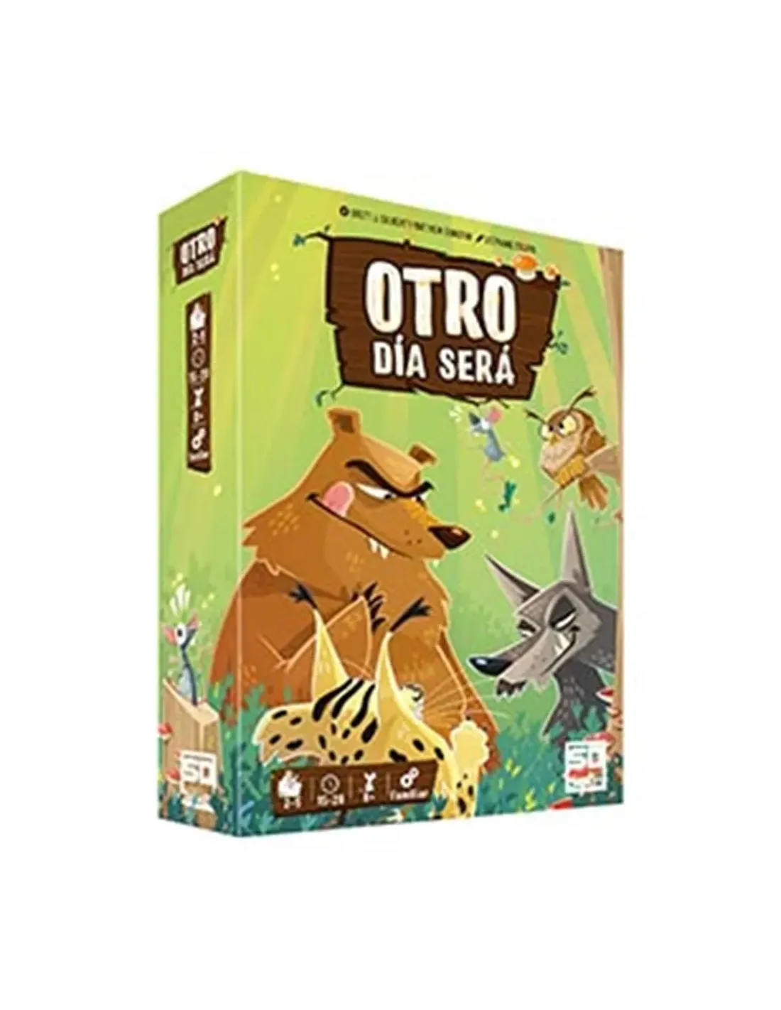 Características del juego de mesa Otro Día SeráEl juego de mesa Otro Día Será es una propuesta divertida y estratégica que mezcla deducción, faroleo y supervivencia en un entorno salvaje donde solo el más astuto prevalece. Ideal para partidas rápidas y con mucha interacción, este juego es perfecto para grupos de 2 a 5 jugadores a partir de los 8 años. Cada decisión cuenta: elige tu animal, anticipa los movimientos rivales y conviértete en el depredador dominante.Un juego de elección secreta y ataque por sorpresaEn cada ronda, los jugadores seleccionan en secreto un animal con habilidades específicas. La clave está en saber cuándo atacar, defender o esperar para sorprender a los demás y maximizar tus puntos.Elige tu animal: cada especie tiene su momento ideal para actuarSal de caza: si tu animal está en el turno activo, puedes atacarDevora presas: deduce qué han jugado los demás y actúa en consecuenciaDinámico, rápido y lleno de interacciónGracias a sus mecánicas sencillas y su ritmo ágil, Otro Día Será es un juego perfecto para sesiones informales o como aperitivo lúdico. El componente de bluff y lectura del rival hace que cada partida sea diferente.Duración de partida: 20 minutos aprox.Número de jugadores: de 2 a 5Edad recomendada: a partir de 8 añosContenido de la cajaIncluye todo lo necesario para empezar a jugar nada más abrir la caja, con diseño temático y componentes duraderos.25 cartas de animales5 cartas de orden de llamada25 fichas de comidaOtras especificacionesTipo de juego: Deducción, faroleo, estrategia ligeraTemática: Animales salvajes en la cadena alimenticiaFormato: Caja compacta y fácil de transportar