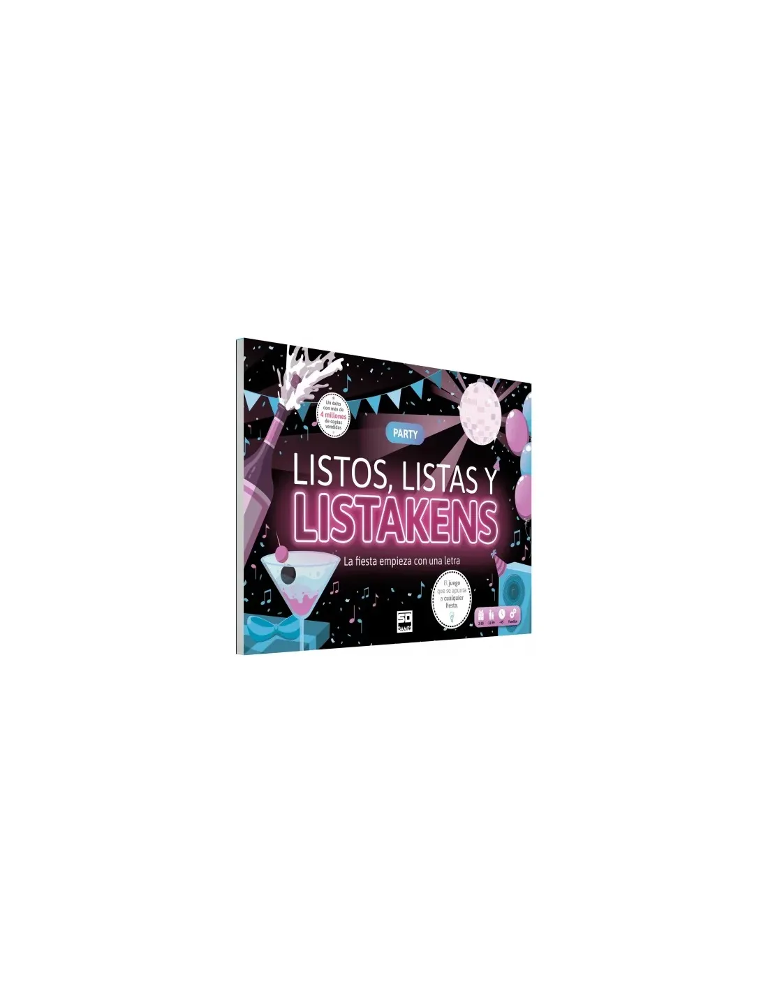 Características de Listos, Listas y Listakens PartyListos, Listas y Listakens Party es un juego de mesa ágil y divertido que pondrá a prueba tu rapidez mental y creatividad. Diseñado para grandes grupos y con 32 categorías diferentes, este juego es perfecto para fiestas, reuniones familiares o quedadas con amigos. A partir de los 12 años, cualquier persona puede unirse a la acción y demostrar su agilidad verbal. ¡Piensa rápido, responde y suma puntos para ganar!Dinámica sencilla, diversión garantizadaEl juego propone una mecánica muy fácil de seguir pero altamente competitiva. Cada ronda se convierte en un reto de velocidad y memoria, donde cada segundo cuenta. Ideal para quienes disfrutan de juegos tipo stop, scattergories o juegos de palabras.Fase 1: Se elige una letra al azar. Cuando alguien diga "¡STOP!", esa será la letra de la ronda.Fase 2: Rellena la fila con palabras por categoría que comiencen por esa letra.Fase 3: Suma puntos por cada acierto y duplica con las casillas "Listakens ? Doble puntuación".Ideal para grupos grandes y eventosCon una duración aproximada de 45 minutos por partida y posibilidad de jugar desde 2 hasta 50 personas, es una opción excelente para dinamizar cualquier evento. Cada hoja del bloc sirve como tablero personal para competir ronda tras ronda.Incluye bloc de 50 hojas reutilizables por partidaEdad recomendada: a partir de 12 añosNúmero de jugadores: 2 a 50 personasDuración aproximada: 45 minutosEstimula el lenguaje, la memoria y la creatividadEste juego no solo entretiene, sino que también fortalece habilidades cognitivas. ¡Perfecto para entrenar el vocabulario y pasar un rato inolvidable!32 categorías diferentes para cada rondaCasillas especiales para duplicar puntuaciónJuego sin necesidad de montaje o accesorios adicionales