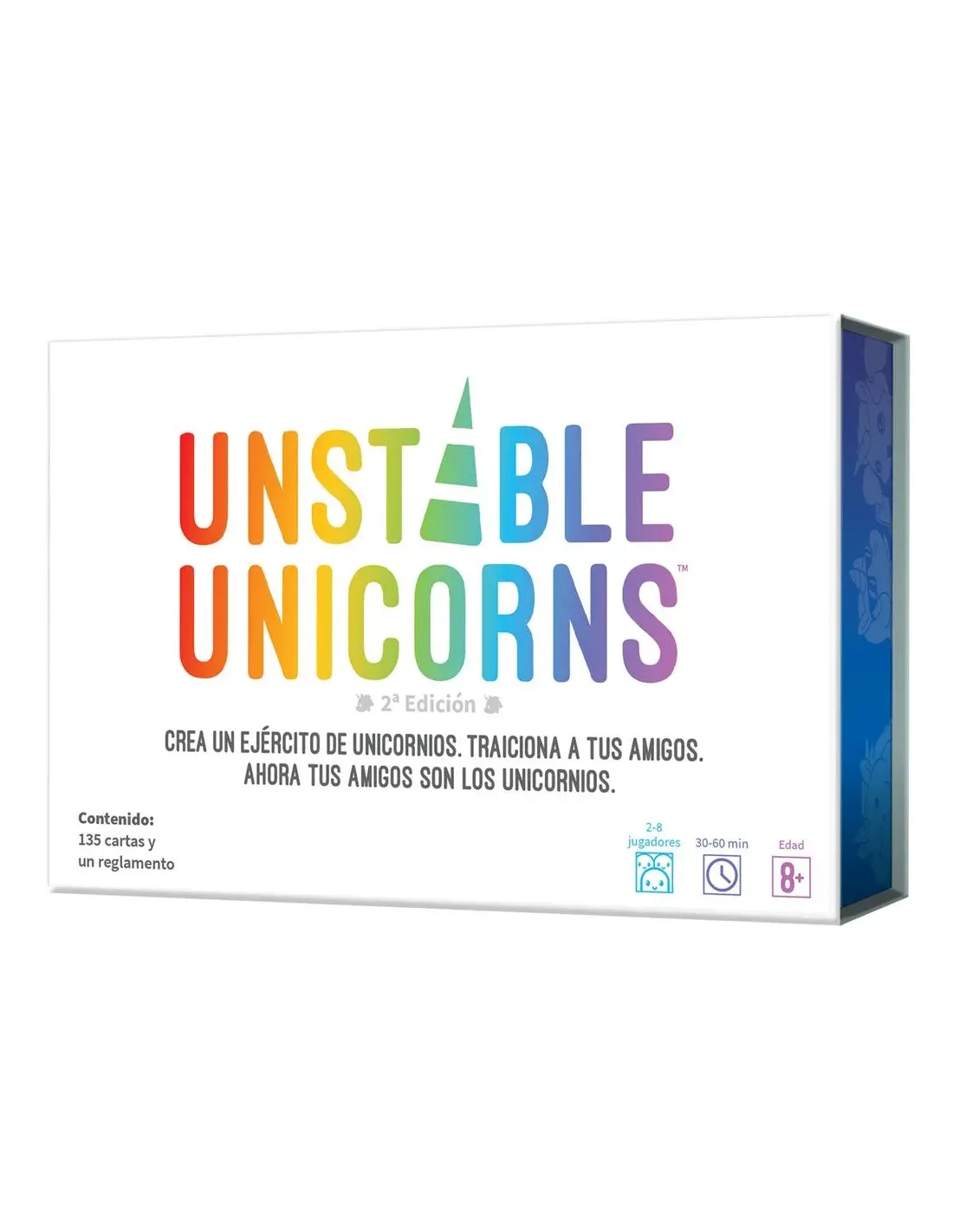 Características del Juego de Mesa Unstable Unicorns PEGI 8Unstable Unicorns es un divertido y estratégico juego de cartas por turnos en el que deberás construir tu propio ejército de unicornios mientras saboteas los planes de tus amigos. Con una mezcla de estrategia, traiciones y cartas especiales, cada partida se convierte en una experiencia impredecible y muy entretenida. El objetivo es sencillo: ser el primer jugador en reunir 7 unicornios en tu establo para alzarte con la victoria.Juego de estrategia con unicornios y sabotajeEn Unstable Unicorns, cada jugador deberá usar sus cartas de forma inteligente para construir su establo mientras intenta impedir que los demás lo consigan. Las cartas permiten invocar unicornios, lanzar hechizos o sabotear a tus rivales, creando partidas llenas de giros inesperados y momentos divertidos.Juego de cartas estratégico por turnosObjetivo: reunir 7 unicornios en tu establoInteracción constante entre jugadoresPartidas dinámicas para gruposGracias a su mecánica sencilla y a sus partidas de entre 30 y 45 minutos, este juego es perfecto para disfrutar con amigos o en familia. Permite participar desde 2 hasta 8 jugadores, lo que lo convierte en una opción ideal para reuniones, fiestas o tardes de juegos.De 2 a 8 jugadoresDuración aproximada de 30 a 45 minutosEdad recomendada a partir de 8 añosContenido completo para empezar a jugarEl juego incluye todo lo necesario para comenzar la partida desde el primer momento. Su baraja de 135 cartas introduce diferentes tipos de unicornios, acciones y efectos especiales que aportan gran variedad estratégica. Además, el reglamento incluido explica de forma clara las reglas para aprender rápidamente a jugar.135 cartas incluidasReglamento oficial del juegoGran variedad de cartas y efectosOtras especificacionesTítulo: Unstable UnicornsFecha de lanzamiento: 12/11/2021Editorial: TeeTurtleCategoría: Juego de cartasColección: Unstable UnicornsIdioma: Español