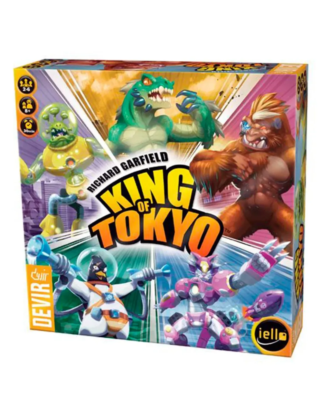 ¡Toma control de un MegaMonstruo y destruye todo lo que encuentres a tupaso! Lanza los dados para conseguir la mejor combinación con la quecurarte, atacar, comprar cartas especiales o ganar Puntos de Victoria. Túdecides qué táctica usar para conseguir ser King of Tokyo: acumular 20Puntos de Victoria o ser el último Monstruo en pie. Ambas opciones teconvertirán en el Monstruo vencedor. Incluye 66 cartas de juego. Un juegode Richard Garfield.NÚMERO DE JUGADORES Min:2 Máx:6TIEMPO DE JUEGO 30 min.EDAD RECOMENDADA 8 AÑOSFECHA DE LANZAMIENTO 01/09/2014