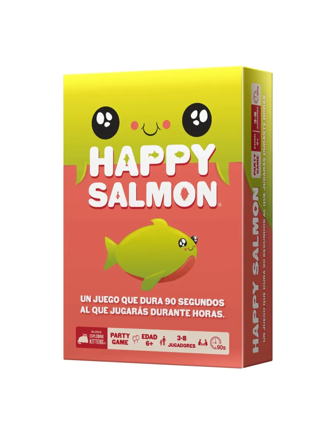 Características del Juego de Mesa Happy Salmon PEGI 6El Happy Salmon es un juego de cartas rápido, dinámico y lleno de energía, ideal para disfrutar en familia o con amigos. Diseñado para jugadores a partir de 6 años, ofrece partidas cortas pero intensas donde la diversión, el movimiento y la interacción constante son los protagonistas. Perfecto para animar cualquier reunión, es un juego que garantiza risas desde el primer segundo.Dinámica de juego rápida y muy interactivaLa mecánica de Happy Salmon es sencilla pero tremendamente adictiva: los jugadores deben gritar sus acciones y encontrar coincidencias con otros participantes lo más rápido posible. Cada encuentro exitoso permite descartar cartas, acercándote a la victoria en un entorno caótico y divertido.Acciones simples que requieren interacción entre jugadoresPartidas de aproximadamente 90 segundosGana quien se queda sin cartas primeroIdeal para grupos y todas las edadesGracias a su accesibilidad y ritmo frenético, es un juego perfecto tanto para niños como para adultos. Su formato lo convierte en una excelente opción para reuniones, fiestas o momentos en familia, fomentando la participación activa de todos los jugadores.De 3 a 8 jugadoresEdad recomendada a partir de 6 añosReglas fáciles de aprenderContenido completo para empezar a jugar al instanteEl juego incluye todo lo necesario para comenzar la partida sin complicaciones. Su diseño compacto permite transportarlo fácilmente y disfrutarlo en cualquier lugar.96 cartas de acción1 folleto con reglas del juegoFormato de juego de cartas compactoEdición en español de Exploding KittensPublicado por Exploding Kittens, este título destaca por su calidad y enfoque en la diversión inmediata. Disponible en idioma español, es ideal para jugadores que buscan una experiencia accesible y directa.Editorial: Exploding KittensIdioma: EspañolFecha de lanzamiento: 30/04/2023Otras especificacionesCategoría: Juego de cartasColección: Happy Salmon