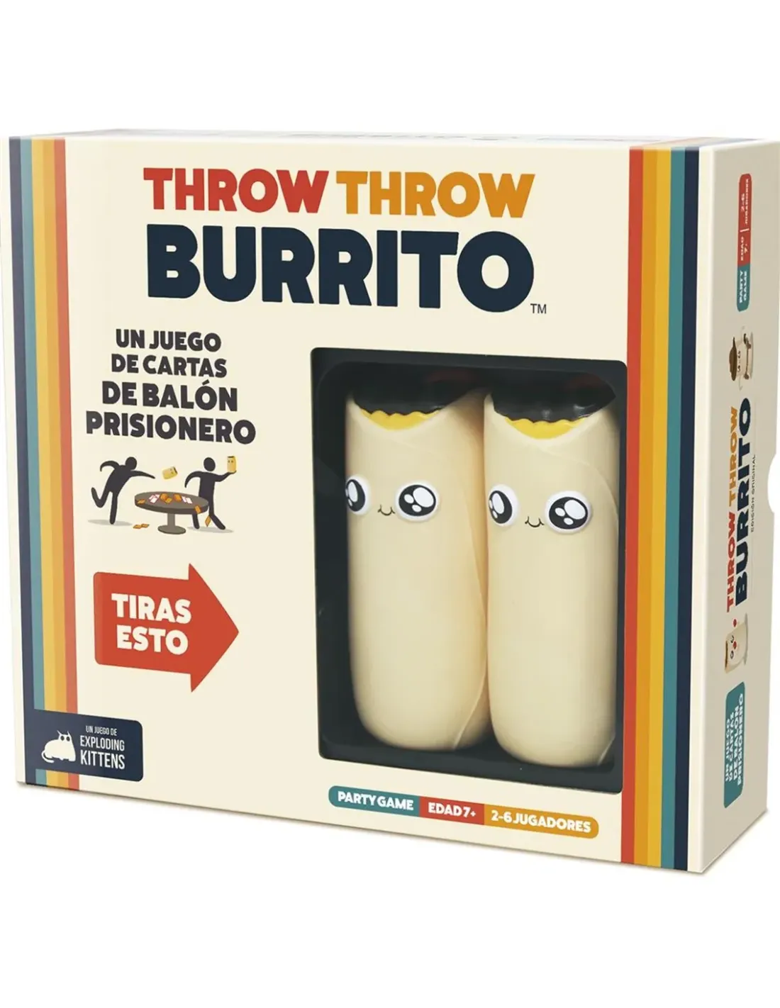 Características del juego de mesa Asmodee Throw Throw BurritoThrow Throw Burrito es un divertido y caótico juego de mesa que combina cartas y acción física en una experiencia totalmente diferente a los juegos tradicionales. En esta original propuesta de Exploding Kittens, los jugadores compiten por conseguir puntos mientras roban cartas, forman combinaciones y, en los momentos clave, se lanzan burritos de espuma entre sí. Diseñado para partidas rápidas y llenas de risas, es una opción perfecta para jugar con amigos o en familia.Juego de cartas con acción realLa mecánica del juego mezcla la estrategia de los juegos de cartas con la diversión del clásico balón prisionero. Los jugadores intentan conseguir puntos formando combinaciones de cartas, pero ciertas cartas activan duelos o batallas en las que deberán lanzar los burritos de espuma a sus oponentes.Combinación de juego de cartas y acción físicaPartidas rápidas, dinámicas y muy divertidasIdeal para grupos y reuniones con amigos o familiaDiseñado para jugar en grupoEste juego está pensado para que participen entre 2 y 6 jugadores, lo que lo convierte en una excelente opción para reuniones, fiestas o tardes de juegos. Su edad mínima recomendada de 7 años permite que tanto niños como adultos puedan disfrutar de la experiencia.Número de jugadores: 2 a 6Edad mínima recomendada: 7 añosIdioma: EspañolContenido completo para empezar a jugarLa caja incluye todos los elementos necesarios para comenzar la partida desde el primer momento. Sus burritos de espuma y las cartas especiales hacen que cada partida sea imprevisible y llena de momentos divertidos.120 cartas2 burritos de espuma6 fichas de Moratón de Burrito1 insignia "Témeme"Otras especificacionesTítulo: Throw Throw BurritoEditorial: Exploding KittensCategoría: Juego de cartasColección: Throw Throw BurritoFecha de lanzamiento: 30/07/2021