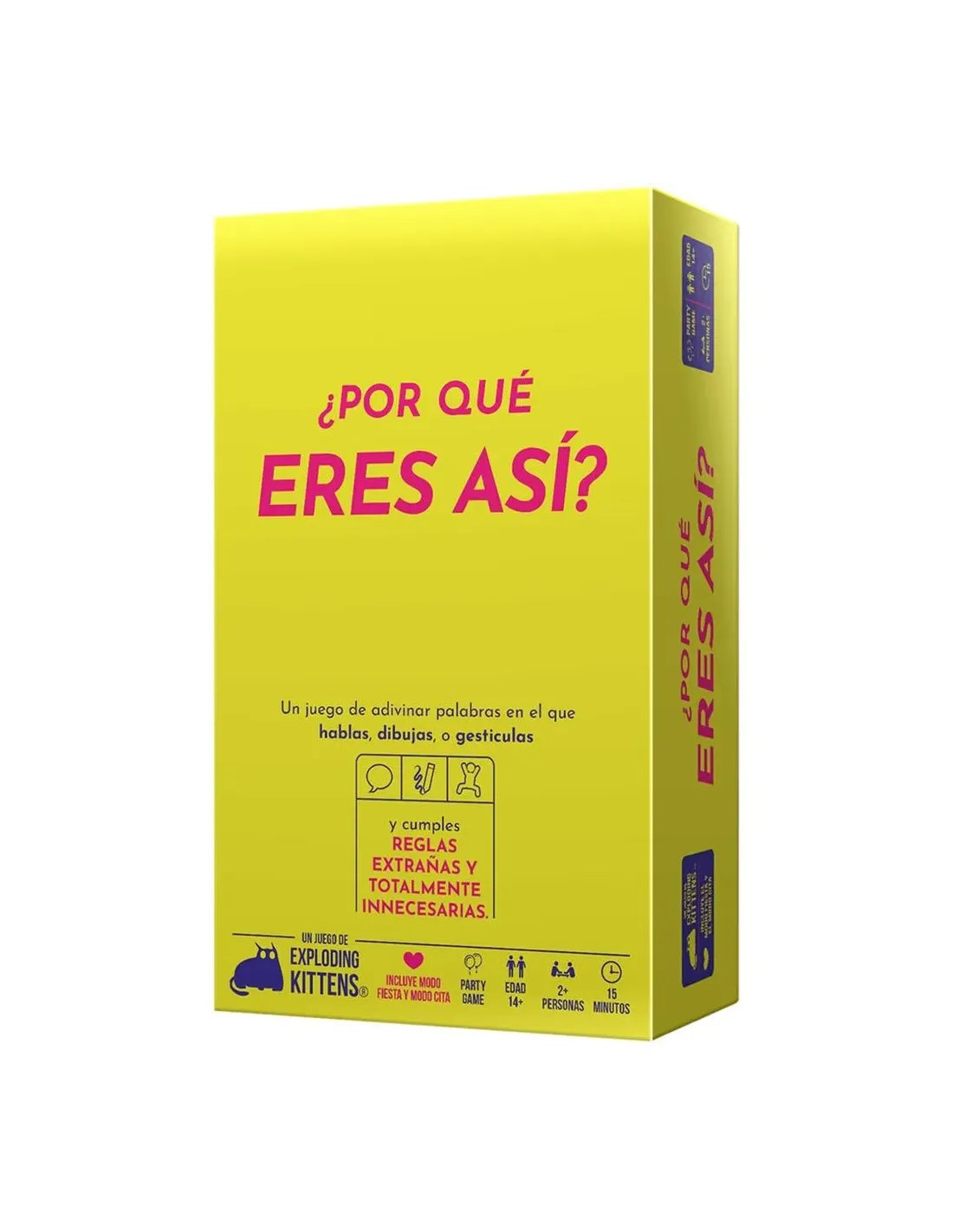 Características del Juego de Mesa ¿Por qué eres así?El juego de mesa "¿Por qué eres así?" es una propuesta divertida y dinámica para disfrutar en grupos o en pareja. Con un enfoque en la creatividad y el humor, este juego combina hablar, dibujar y gesticular mientras desafías a tu equipo o pareja a adivinar palabras bajo reglas y dificultades que garantizan risas y entretenimiento. Ideal para fiestas, reuniones o citas, promete momentos inolvidables y altamente interactivos.Modo Fiesta: Competitivo y DivertidoEn su modo fiesta, el juego se juega con 4 o más personas en equipos. Cada turno, un jugador dará pistas utilizando solo una de las acciones permitidas: hablar, dibujar o gesticular. A esto se le suma una dificultad extra que hace que el reto sea mucho más emocionante. El equipo que adivine más palabras antes de que se acabe el tiempo, gana.Jugadores: 4 o másCompetitivo entre equiposDesafíos creativos y dinámicosModo Cita: Cooperativo y EntretenidoEl modo cita está pensado para 2 o más jugadores, jugando en pareja. La mecánica es similar al modo fiesta, pero con un enfoque cooperativo: ambos intentan adivinar las palabras siguiendo reglas como hablar, dibujar o gesticular, sumando la dificultad extra. Ganaréis si adivináis todas las palabras a tiempo, lo que fomenta la colaboración y la diversión compartida.Jugadores: 2 o másCooperativo en pareja o grupos pequeñosRisas y entretenimiento garantizadoComponentes del JuegoEl juego incluye todos los elementos necesarios para disfrutar de sus modos de juego de manera completa y organizada.55 cartas de desafío1 libreta y 1 bolígrafo200 cartas de palabraDetalles AdicionalesTítulo: "¿Por qué eres así?"Referencia: EKIWYLT01ESFecha de lanzamiento: 21/03/2025Editorial: Exploding KittensCategoría: Juego de tableroColección: Why Are You Like This?Idioma: EspañolEdad recomendada: 14 años en adelanteDuración promedio: 15 minutosNúmero de jugadores: 2 o másEAN: 0810083048291