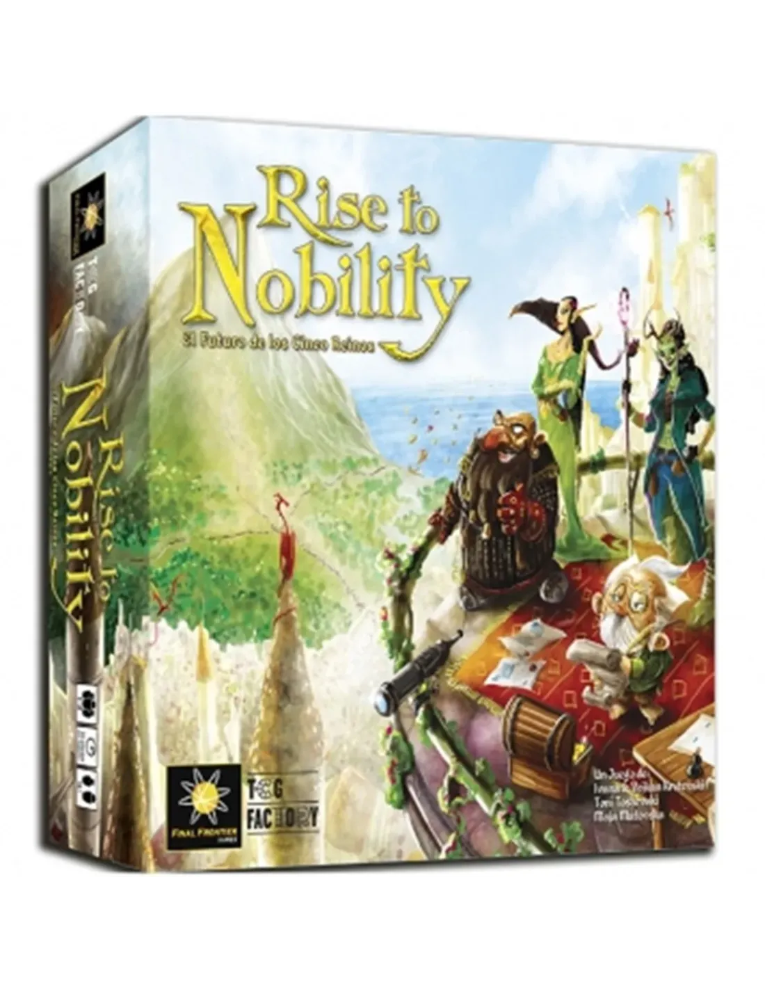 En Rise to Nobility, entre 2 y 6 jugadores se convierten enterratenientes en el mundo de fantasía que creó Final Frontier conCavern Tavern. Inmersos en una ciudad recién fundada y con laamenaza de la guerra todavía pendiendo en el horizonte, tendránque ingeniárselas para contribuir al enriquecimiento común a lavez que tratan de prosperar hasta convertirse en nobles al frentedel Consejo de Piedra.Rise to Nobility es un juego de colocación de trabajadores (en estecaso dados) ambientado en el universo de fantasía de CavernTavern. Cada jugador se convierte en terrateniente a cargo de unpequeño terreno en la recién creada ciudad de Cuevanueva. Sal delanonimato, consigue el título de lord y aúpate hasta la deseadasilla de líder del Consejo de Piedra.Para lograrlo, mejora tus tierras y satisface las demandas de loscolonos. Dales un techo, cubre sus necesidades, búscales unbuen trabajo y ayúdales a ascender de aprendices a maestros degremio. ¡Y asegúrate de contar con gente de confianza en lospuestos más relevantes de Cuevanueva!Contenido:1 tablero principal1 tablero secundario1 tablero de puntuación6 tableros de jugador48 cartas de colonos13 cartas de personaje16 cartas de evento18 cartas de encargo6 cartas de ayuda5 cartas de preparación15 cartas de objetivo48 losetas de edificio30 losetas del Consejo de Piedra18 losetas de barco30 dados104 fichas120 cubitos de madera84 meeples42 casas de madera21 indicadores de madera personalizados18 losetas de dado
