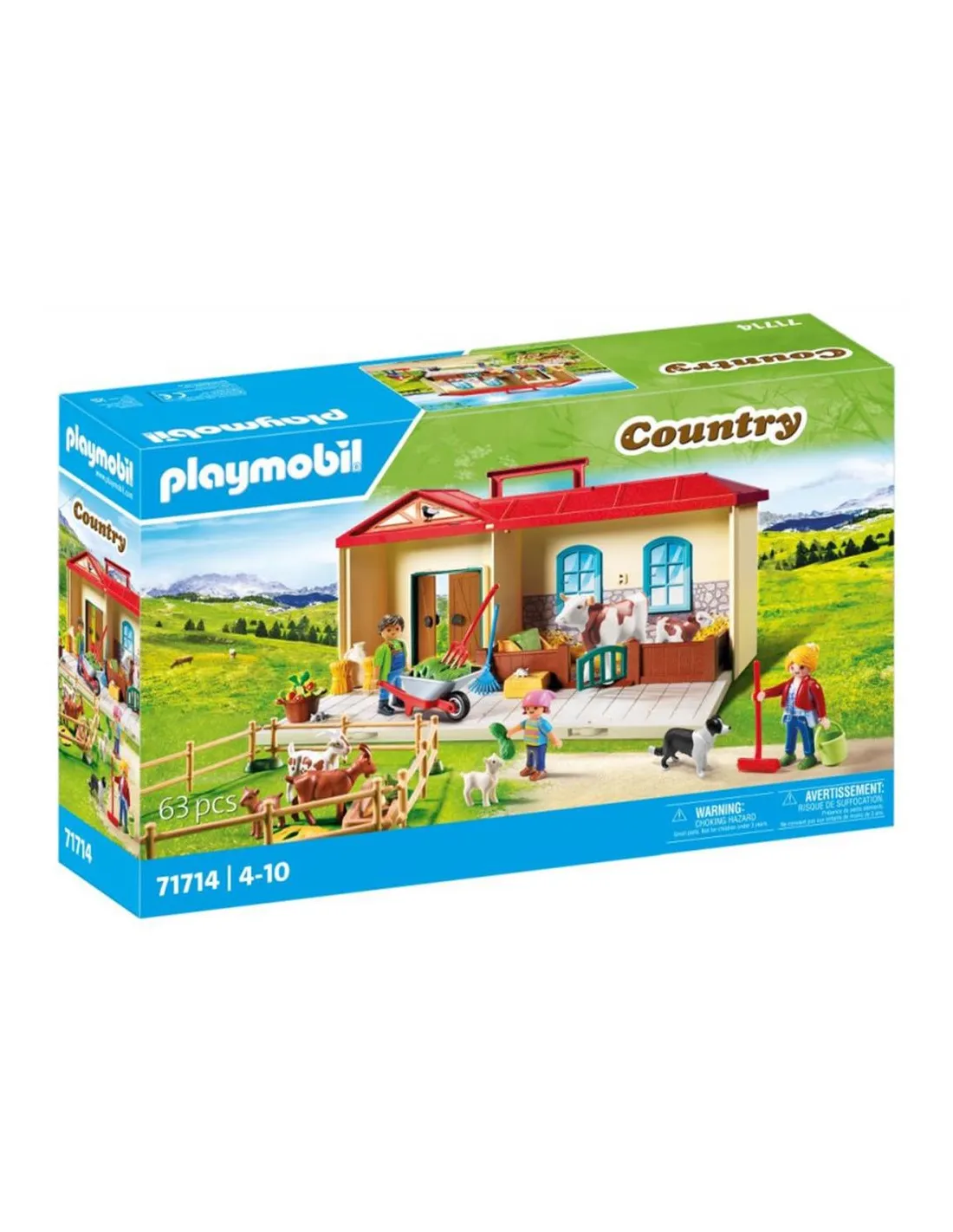 Es maletín y en ella puedes guardar todos los accesorios. incluye 3 figuras (2 adultos y una niña) - 2 vacas - 4 cabras - gato - 2 ratónes - zanahorias - manzanas - valla - heno - carretilla y rastrillo.