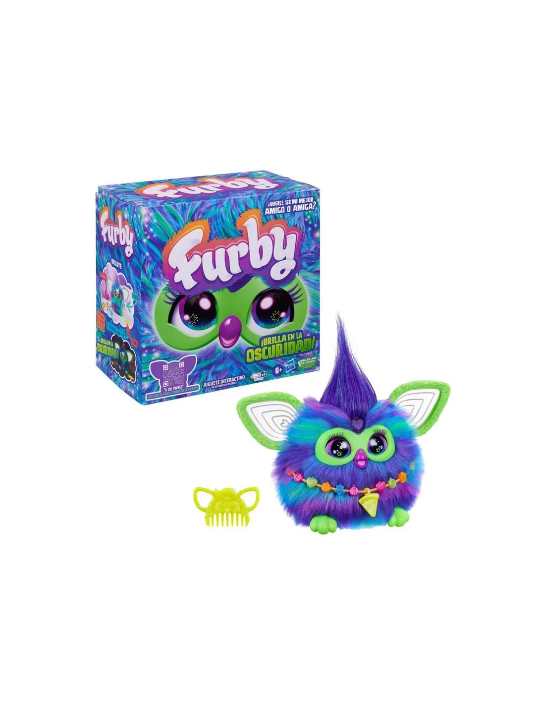 ¡Conoce la edición Furby Galaxy que brilla en la oscuridad! Esta curiosa criaturita es un amigo interactivo de juguete con 5 modos activados con voz y más de 600 frases, chistes, canciones y mucho más que descubrir. dile a Furby lo que quieres hacer con estos 5 comandos: a bailar, imitación, adivina mi futuro, a relajarse y fiesta de luces. furby también responde cuando lo abrazas, le tocas la cabeza, lo sacudes y lo alimentas con su dije en forma de pizza de juguete (o con tu dedo - qué rico). ¡Cuanto más jueguen, más cosas divertidas desbloquearán! Cuida a Furby alimentándolo y peinándolo. Vístelo con los adornos con clip que brillan en la oscuridad y crea accesorios de moda que los pequeñines pueden usar también. Estos juguetes electrónicos de peluche para niños y niñas a partir de 6 años son excelentes regalos infantiles y divertidos compañeros. Como diría Furby, dah-no-lah (¡fiesta!)