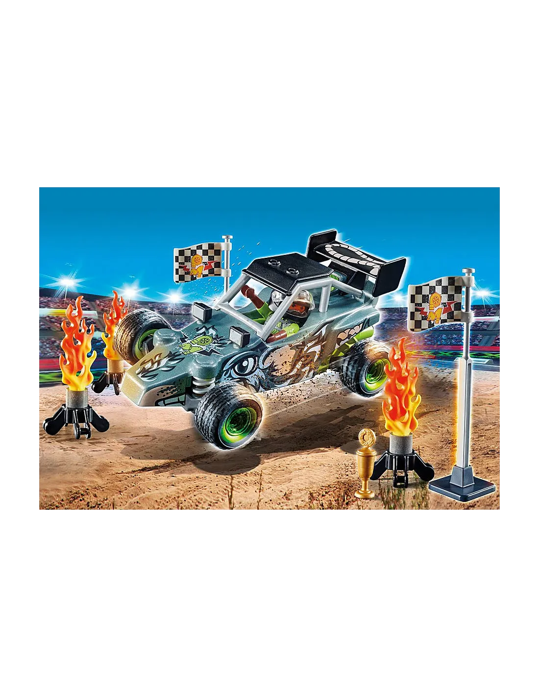 Acrobacias impresionantes con el genial Stuntshow Racer de PLAYMOBIL! Este set de juego lleno de accin har las delicias de los aficionados a las acrobacias. El elegante corredor con barra antivuelco proporciona mucha accin. Dirige el vehculo sobre la pista de carreras pasando por las peligrosas columnas de fuego y llega a la lnea de meta en primer lugar. Diversin trepidante a partir de 4 aos. Incluye una figura PLAYMOBIL con casco, un coche de acrobacias, banderas de ganador, bidn de gasolina, trofeo y otros extras para un emocionante juego de rol. El buggy se puede repostar en la apertura con el bidn. Se puede combinar el coche de carreras con otros sets del mundo Stuntshow de PLAYMOBIL.