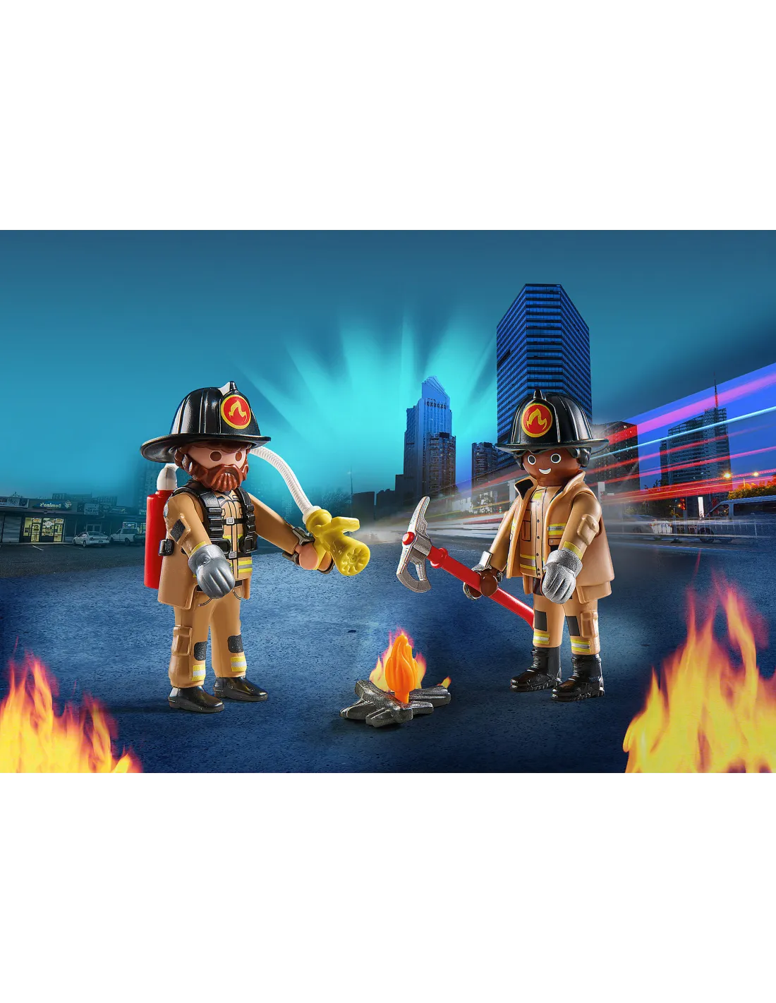 Corre al rescate con el valiente equipo de bomberos de PLAYMOBIL. Con un extintor y un hacha, los bomberos se dirigen a extinguir las llamas. Los guantes y los cascos se pueden quitar. El set de juego incluye dos figuras PLAYMOBIL, extintor, hacha y extintor. El producto contiene dos figuras con accesorios que proporcionan mucha diversin en el juego de roles. Los DuoPacks de PLAYMOBIL son el regalo ideal para cumpleaos, vacaciones o cualquier otro da, a partir de 4 aos.