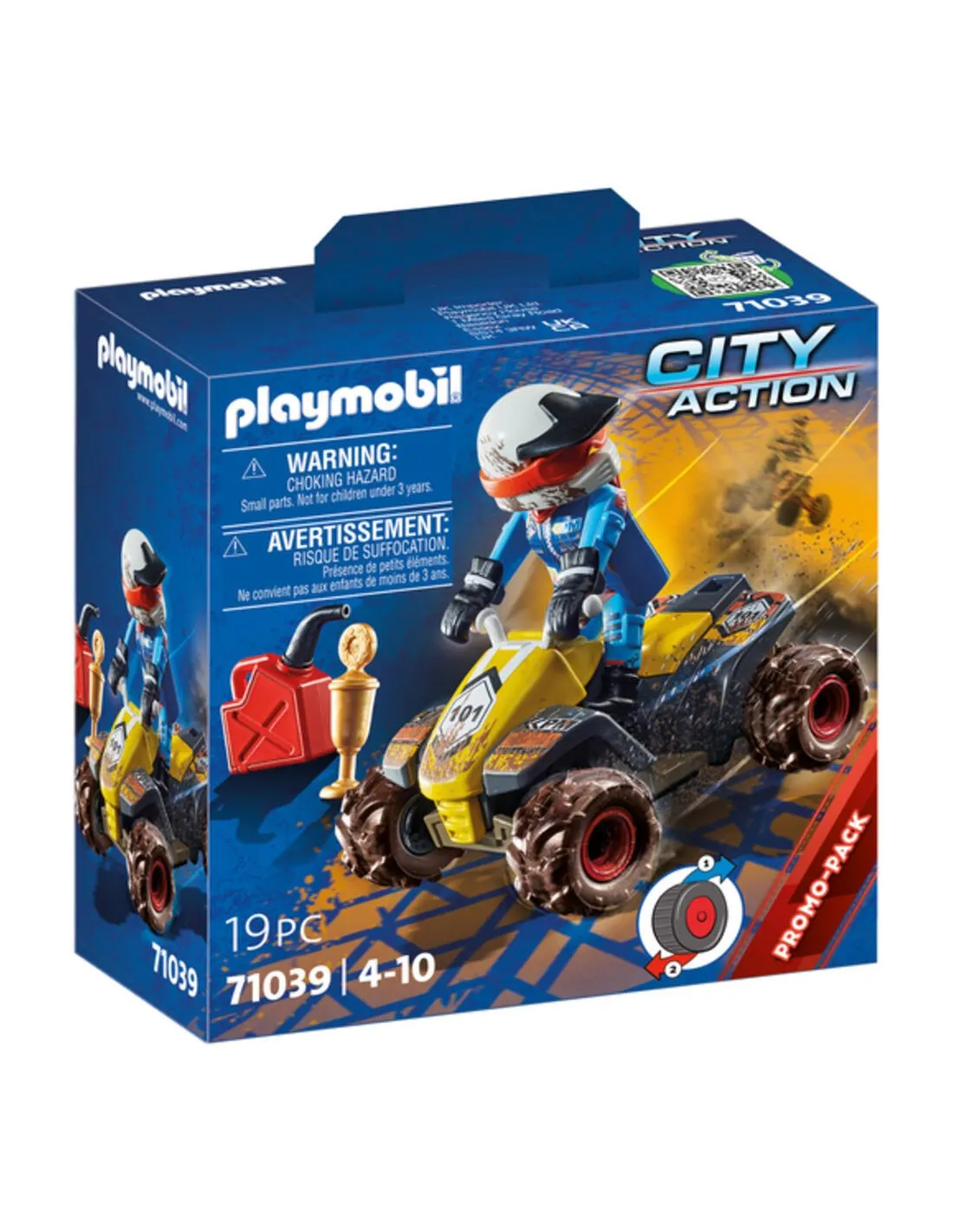 Preprate para una emocionante carreras con el Quad de Offroad de PLAYMOBIL. Con los gruesos y resistentes neumticos, el piloto se abre paso en cualquier recorrido y supera todos los obstculos. Toma con habilidad incluso las curvas ms cerradas y deja atrs a todos los competidores con facilidad. El trofeo de ganador le espera en la lnea de meta. Gracias al prctico motor retrctil, el quad todoterreno ofrece carreras llenas de accin en la habitacin de nios y nias. Un gran regalo o recuerdo para nias y nios a partir de 4 aos. Especificaciones: El set de figuras de juego de 19 piezas incluye una figura PLAYMOBIL, un quad con motor de retroceso, un trofeo, un casco y un bidn de gasolina. Los guantes y el casco con gafas son desmontables. Juega con este set por s solo o combnalo con los otros sets de juego de la serie PLAYMOBIL City Action