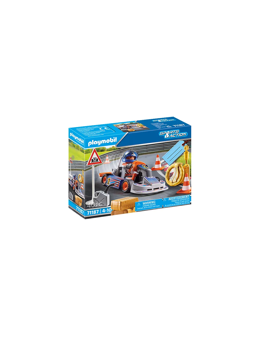 PLAYMOBIL consta de un piloto de carreras PLAYMOBIL, un kart, tres pilones, un trofeo, una corona para el ganador y otros fantásticos accesorios de carreras. El kart se puede repostar con el bidón.