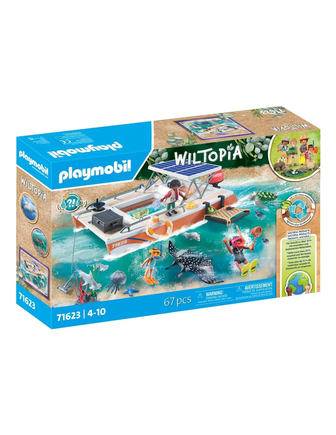 Explora las maravillas de Australia con el juego sostenible WILTOPIA Plataforma para el análisis del arrecife de PLAYMOBIL. A través del fondo de cristal del catamarán se puede observar la fascinante