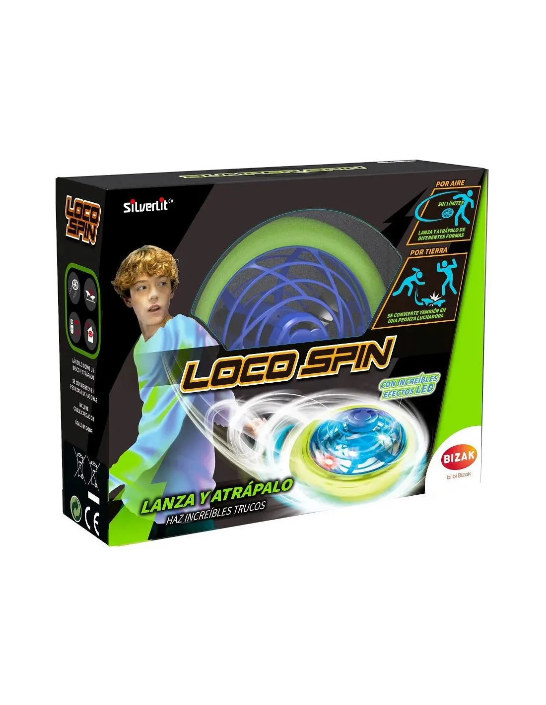 Loco Spin es un fantástico disco volador con infinitas posibilidades. Con un sistema de protección contra choques, lánzalo y atrápalo. Con asombrosos efectos de luz LED y trucos ilimitados, está disponible en 2 colores. Dos modos de juego: Trucos acrobáticos o Modo Pelea de peonzas, perfecciona ambos juegos y conviértete en el jugador máster.
