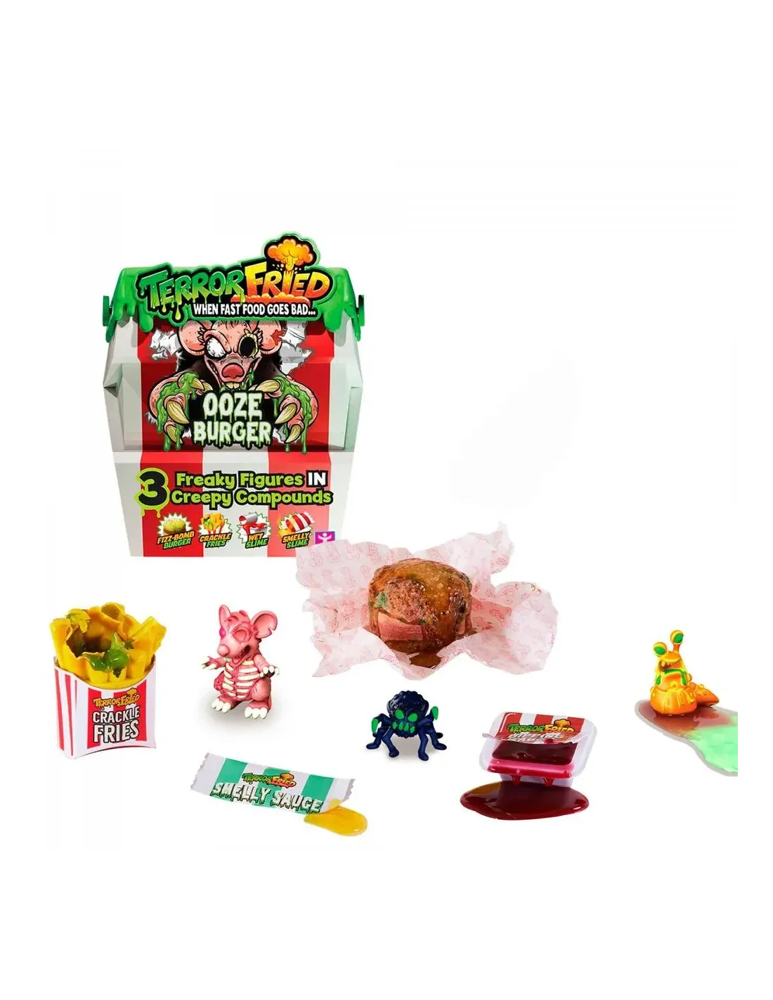 ¡Bienvenido a Terror Fried! Descubre las figuras más espeluznantes dentro de la comida. Cada menú de Terror Fried incluye compuestos asquerosos que puedes aplastar, agrietar y burbujear mientrasjuegas descubriendo figuras asquerosas.Edad recomendada: Más de 5 años