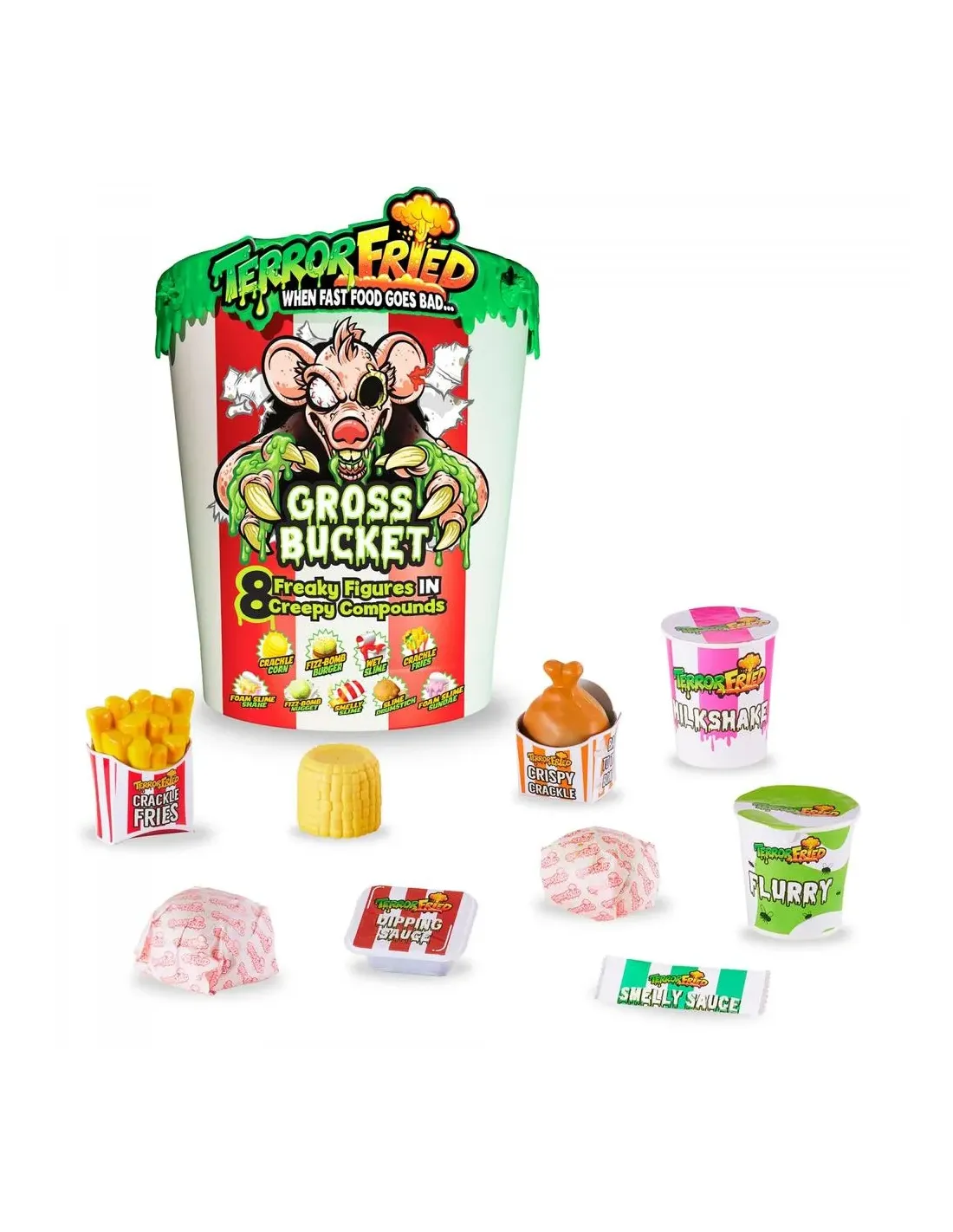 ¡Bienvenido a Terror Fried! Descubre las figuras más espeluznantes dentro de la comida. Cada menú de Terror Fried incluye compuestos asquerosos que puedes aplastar, agrietar y burbujear mientrasjuegas descubriendo figuras asquerosas.Edad recomendada: Más de 5 años
