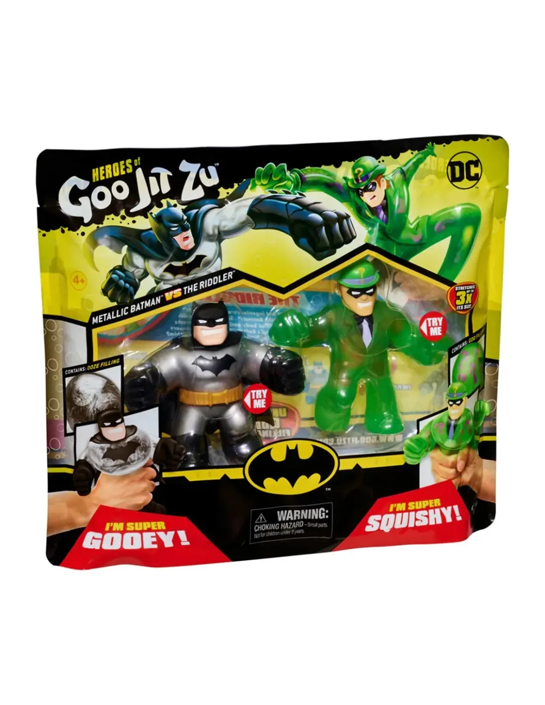 Siempre listo para luchar contra el crimen Metallic Batman responde a la llamada de ayuda de la ciudad. Estira y aprieta su cuerpo lleno de rezumo elástico mientras protege a la gente de Ciudad Góticade su Riddler de una manera nunca vista antes. Batman metálico es súper pegajoso ¡Aprieta y estira su cuerpo para ver el rezumo metálico moverse dentro de su cuerpo!Los superhéroes de DC y los héroes de Goo Jit Zu han combinado fuerzas que traen la línea definitiva de los superhéroes más elásticos, pegajosos y esponjosos de la historia.Hay 2 héroes en el paquete Versus Pack, Batman metálico y el Riddler. Cada héroe es exclusivo y solo se puede encontrar en este paquete.¡Batman metálico es súper Gooey! Aprieta y estira su cuerpo para ver que el Ooze metálico se mueva dentro de su cuerpo.¡El Riddler es súper esponjoso! Aprieta su cuerpo y mira cómo el slime se abulta para revelar marcas de interrogación dentro de él.Edad: 4+ años