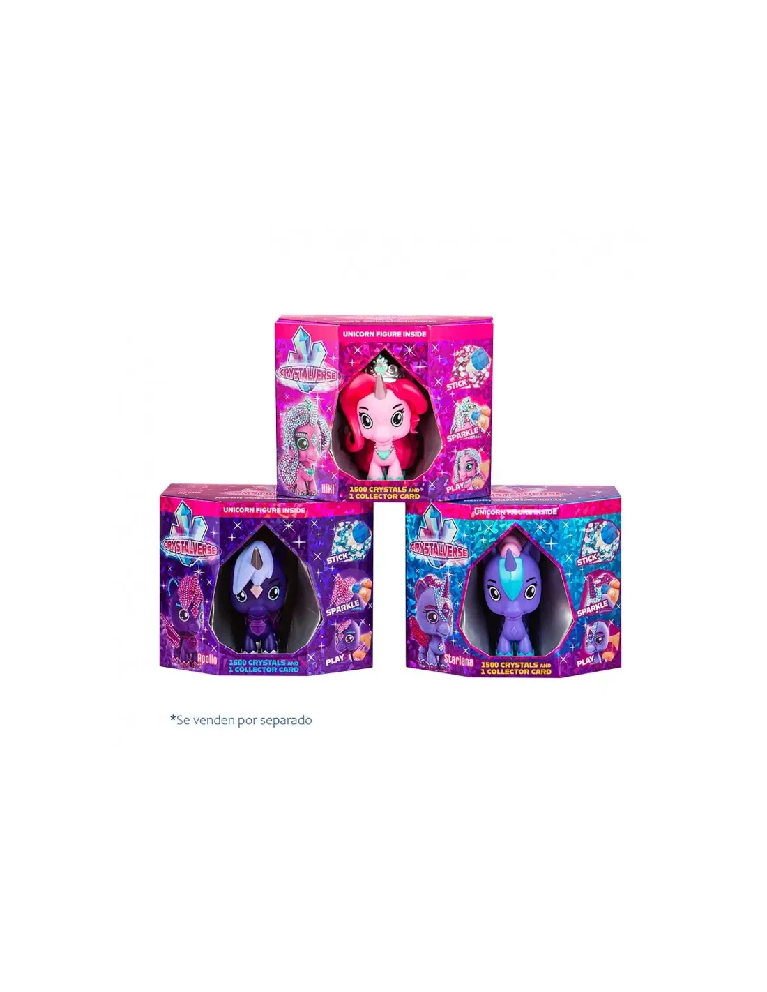 Características de la Figura Unicornio Crystalverse Classic (1 unidad aleatoria)Descubre la magia del universo Crystalverse con estas figuras de unicornios galácticos que combinan juguete y manualidad en una sola experiencia. Diseñadas para niñas y niños creativos, las figuras Crystalverse permiten desarrollar la imaginación a través de la personalización con cristales brillantes. Cada paquete incluye una unidad aleatoria de la colección Classic.Creatividad y personalización con 1.500 cristalesEstas figuras de unicornio no solo destacan por su diseño galáctico, sino también por la posibilidad de decorarlas a tu gusto. Gracias a su sistema de aplicación de cristales, cada niño puede crear su propio estilo único mientras mejora su motricidad fina y sentido estético.Incluye 1.500 cristales de colores para personalizar la figuraAplicador de cera, bandeja y pegamento de 10 ml incluidosInspirado en el arte de la "pintura de diamantes"Un juguete galáctico coleccionableCada caja contiene una figura moldeada de 11 cm aleatoria de la serie Classic, con estilo propio y tarjeta de coleccionista. Ideal para juegos de imaginación, coleccionismo y decoración infantil. Perfecto para regalar o para quienes disfrutan de las manualidades creativas.1 unicornio aleatorio de 11 cmDiseños con temática espacial y de modaIncluye tarjeta de coleccionistaAdvertencias de seguridadEste producto no es apto para niños menores de 3 años debido a la presencia de piezas pequeñas que podrían causar atragantamiento. Se recomienda la supervisión de un adulto durante su uso.Contiene piezas pequeñas: peligro de atragantamientoLos colores y modelos pueden variar según disponibilidadConservar el envase y la información del distribuidor