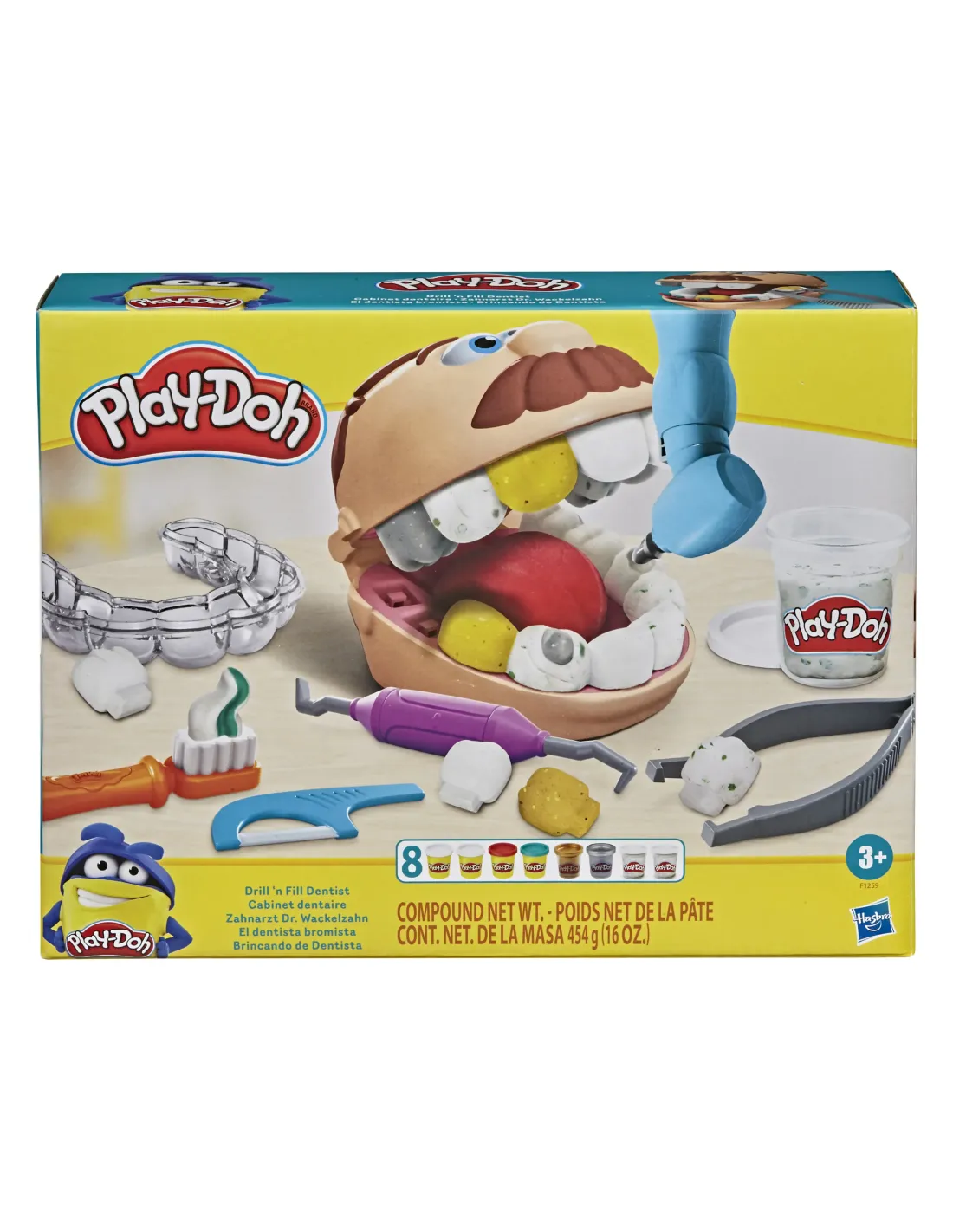 ¡El dentista bromista se encargará del paciente antes de que le duela el diente!Conviértete en dentista con este playset.Incluye:Paciente, torno, rodillo de frenos, molde de diente, cepillo de dientes, jeringa extrusora, espejo, palillo, hilo dental, pinzas y 8 botes de plastilina Play-Doh (peso neto: 454 g).La masa modeladora no es comestible. Se necesita el montaje por parte de un adulto.ADVERTENCIA a los padres: contiene trigo. No tóxico. Conforme a ASTM D-4236.RECOMENDACIÓN:Para limpiar, deja que se seque y luego raspa o aspira para eliminar restos. Los resultados de las creaciones pueden variar en función de la edad y la habilidad del niño.
