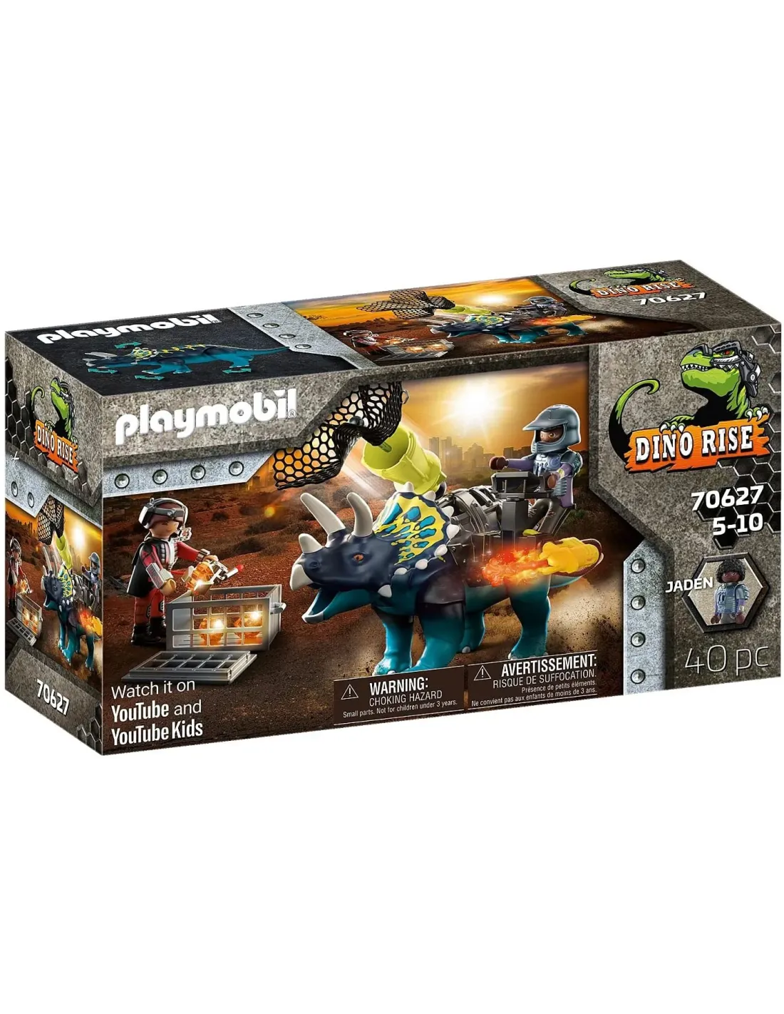 Equipado con un cañón de red de seguridad, armadura extraíble, la figurapuede montar en el triceratopsA veces el enemigo es mucho más pequeño de lo esperado, por ejemplo unmini robot. Estas pequeñas y desagradables máquinas intentan explorar losplanes del equipo Dino Rise sin ser vistas y preparan a los grandes robotsde combate para la batalla. Pero el equipo Dino Rise no se deja ver tanfácilmente. Para estar equipado contra adversarios grandes y pequeños, elTriceratops acorazado no sólo tiene un cañón normal, sino también uncañón de red trampa. Si su compañero Jaden lanza la red de captura en elmomento adecuado, los mini robots quedan inmovilizados. Un fuerte poderdino-humano para misiones especiales complicadas.