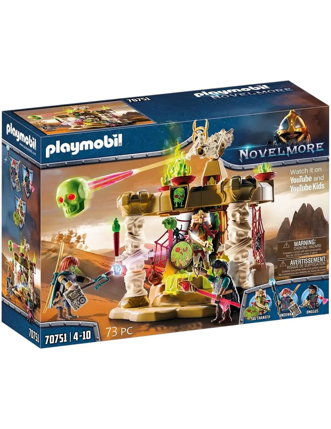 incluye función de inducción que hace que los ojos de las figuras brillen.El reluciente templo de Sal'ahari Sands es lo que los espeluznantesguerreros esqueléticos llaman hogar. Es aquí donde el ejército de nomuertos, liderado por el temible Skeleton King Sul'thanath, planea supróximo movimiento contra Novelmore.Como no muertos, no temen a nada ni a nadie. Si alguien se atreve aacercarse al templo, es recibido con balas de calavera del cañón de losesqueletos. Antes de cada batalla, los no muertos reponen su energía. Paraello, se colocan en el manantial mágico que hay en el centro del templo yesperan a que les cargue por completo y sus ojos empiecen a brillar. No sedebe jugar con estos siniestros guerreros del desierto. El set de juegocontiene el Skeleton King Sul'thanath, así como los dos aprendices de brujoOmagus y Andowan, un templo con módulo de luz, cañón esquelético, telasde araña, antorchas y muchos otros extras. La cabeza de las figuras estáequipada con un dispositivo de almacenamiento de energía que puedecargarse mediante la bobina de inducción del templo, lo que hace que losojos de las figuras brillen.