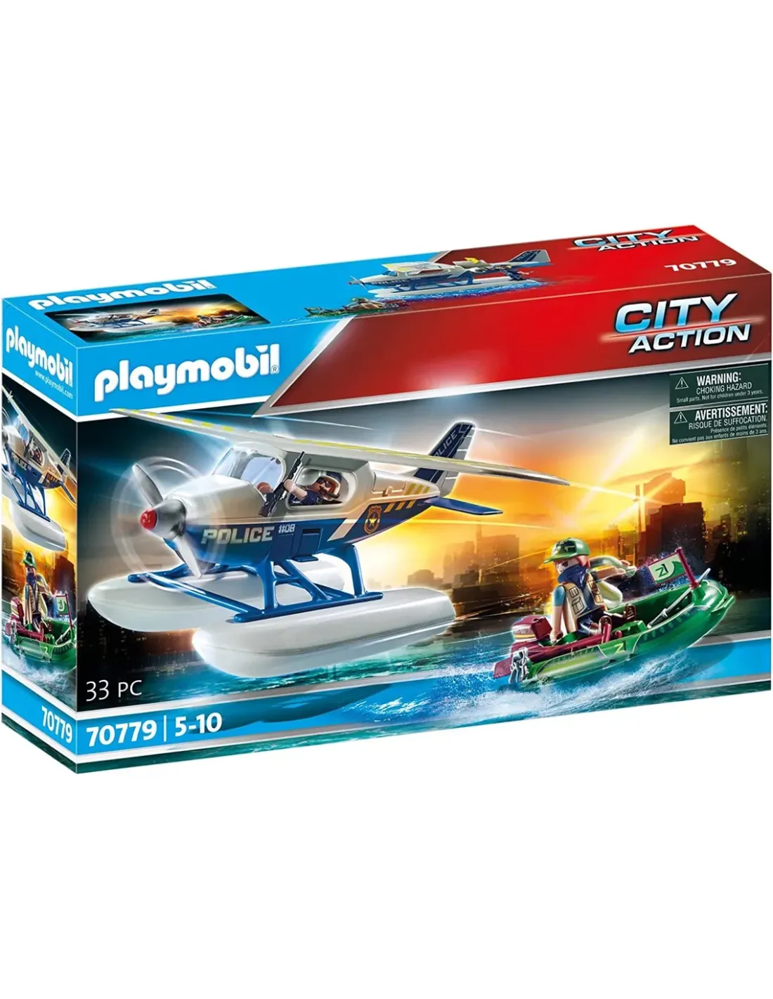 Persecución con la policía de PLAYMOBIL: Avión acuático de policíaPLAYMOBIL con 1 bote inflable, 1 mujer policía PLAYMOBIL y 1 ladrón a lafuga.1 avión acuático flotante de PLAYMOBIL con hélice giratoria, cuerda conpúas para enganchar y asa, 1 barco flotante con 4 asas y mucho más.Para jugar a diario: Incluye instrucciones para montarlo con ayuda de lospadres, Alta calidad y diseño robusto, Limpieza de las piezas (sin pegatinas)con agua corriente y sin químicosJuguete para niños a partir de 5 años: Ideal para el tamaño de sus manos ybordes redondeados agradables al tactoContenido: 1x PLAYMOBIL City Action, Avión acuático de policía, Juego de 33piezas con instrucciones: 1 avión de juguete, 1 barco de juguete, 2 figuras,29 accesorios
