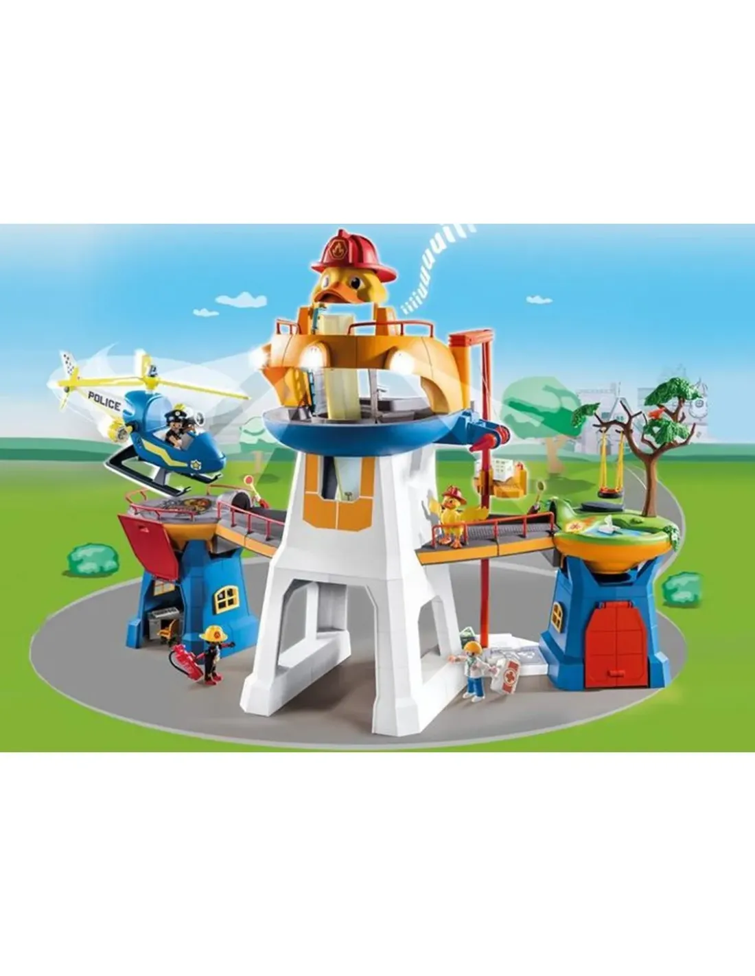 Con efectos de luz y sonido integrados. Incluye tobogán de caída librecon control direccional, elevador de manivela y plataforma de aterrizajepara el helicóptero de la policía. El centro de comando secreto en una delas pequeñas torres y el patio de recreo con estanque, árbol, columpio yescondite secreto ofrecen una experiencia de juego emocionante yagradable.