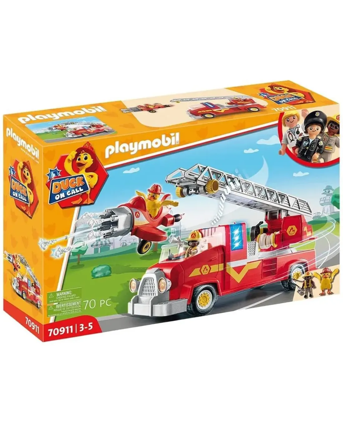 Camión de bomberos Playmobil Duck On Call con efectos de luz ysonido integrados, además de escalera extensible y giratoria. El miniavión desmontable se puede utilizar con su cañón de agua paracombatir incendios de todo tipo.Juego de juguetes para niños de 4 años en adelante: ideal para lasmanos de los niños debido al tamaño apropiado para la edad y lasensación agradable con bordes redondeadosJuego diario: instrucciones para ensamblar junto con los padres,diseño robusto y de alta calidad, limpie las piezas (sin pegatinas) conagua corriente sin productos químicos.
