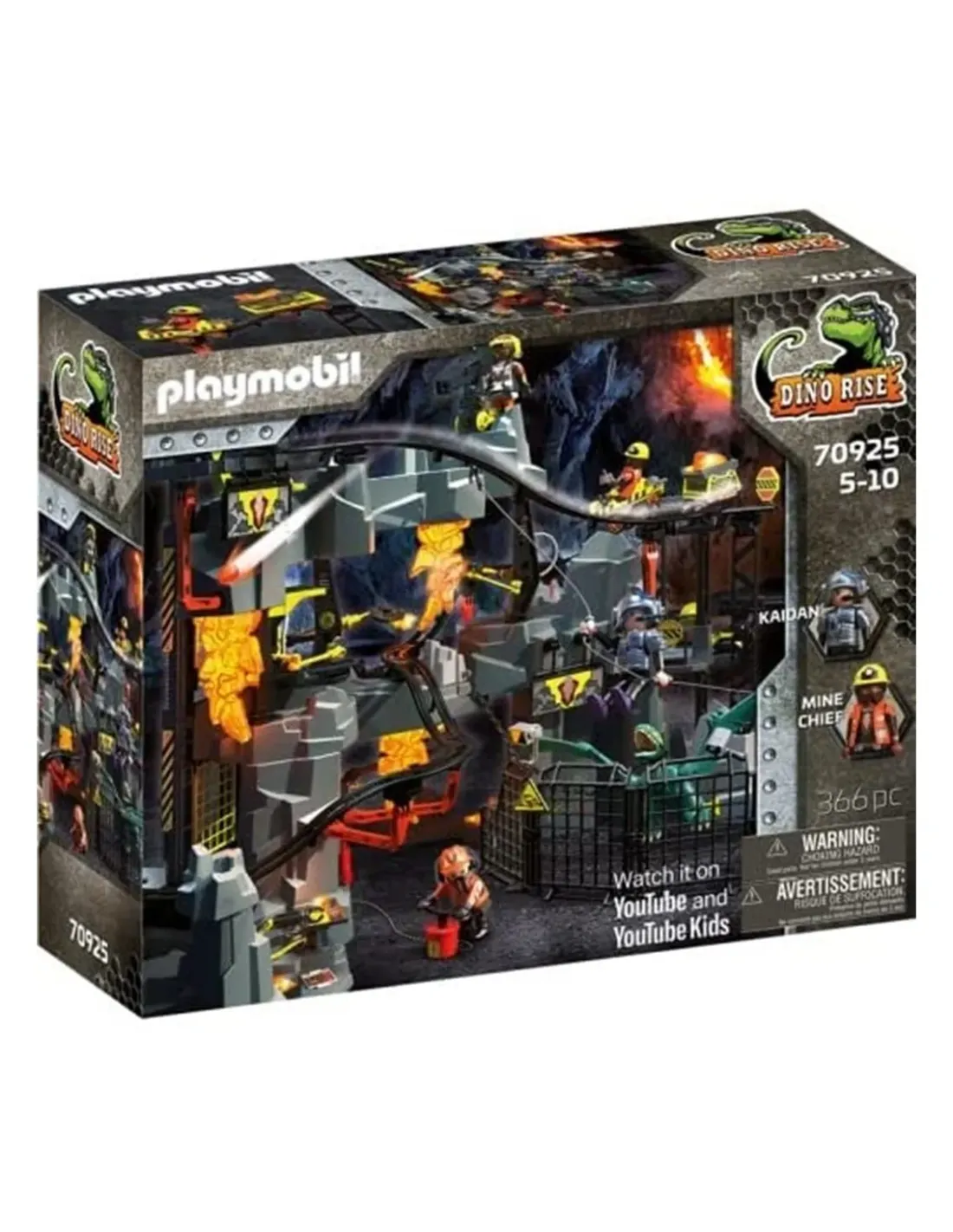 ¡La lucha continúa en la mina!Los vehículos se aferran al interruptor para bajar por la mina.El ascensor permite que los vehículos suban por la mina.El dinosaurio puede ser liberado de la mina.Contiene cuatro personajes, un vagón, un dino y muchos accesorios.Juego de juguetes para niños de 4 años en adelante: ideal para lasmanos de los niños debido al tamaño apropiado para la edad y lasensación agradable con bordes redondeadosJuego diario: instrucciones para ensamblar junto con los padres, diseñorobusto y de alta calidad, limpie las piezas (sin pegatinas) con aguacorriente sin productos químicos.