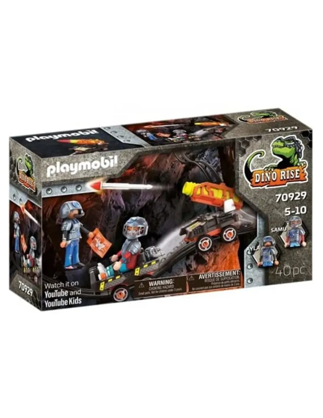 Alya y Samu están a la defensiva con su potente carro cohete. Ofreceespacio para 2 figuras, incluyendo un cañón que funciona y 2proyectiles.Se puede utilizar en la Dino Mine, así como por separado.