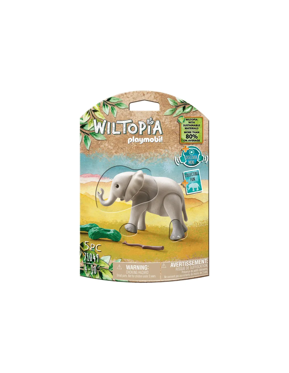 Levanta tu trompa para el Elefante Joven. Usando la tarjeta de animalescoleccionables adjunta con la aplicación Wiltopia, los niños puedenaprender todo sobre los animales y sus hábitats e incluso tomarse unaselfie con ellos al proyectar a los animales directamente en su hogar através de AR.Con Wiltopia, la línea de productos ecológicos de PLAYMOBIL que consiste,en promedio, en más del 80 % de materiales sostenibles, los niños puedenembarcarse en aventuras en regiones vibrantes de todo el mundo,fomentando el aprecio por la vida silvestre que vive allí y por nuestroplaneta en su conjunto.El juego incluye un elefante joven, accesorios y la tarjeta de animalcorrespondiente para desbloquear contenido digital.Juega con este set solo o combínalo con el resto del tema de Wiltopia(#71048- 71074, 71007-71012 - se vende por separado) ¡para una diversiónanimal aún más salvaje!Recomendado para edades de cuatro a diez años.Advertencia. Peligro de asfixia. Pequeñas partes. No para niños menoresde 3 años.