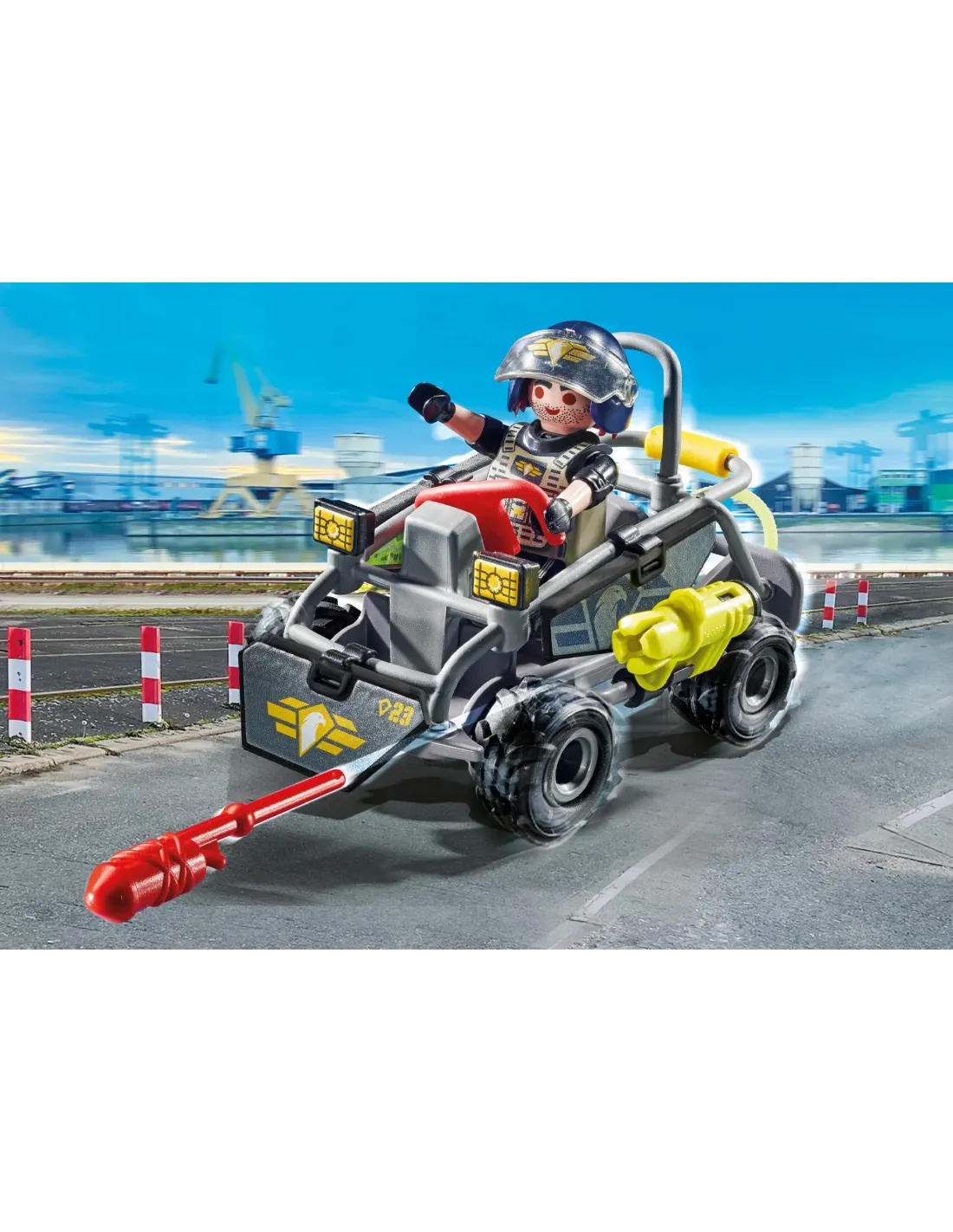 El Quad puede transformarse fácilmente y es ideal para persecuciones en tierra o agua. En pocos pasos, el quad se transforma en una lancha acuática gracias a los flotadores. Las pantallas ópticas se pueden intercambiar. La figura tiene la cabeza reversible y puede transformarse de agente de las fuerzas especiales a delincuente. Un divertido juguete lleno de detalles y funciones geniales para los fans de las historias policiales llenas de acción.Detalles del producto:- El juguete de policía de 59 piezas incluye un quad transformable con cañón acoplable, dinamita, equipo de fuerzas especiales y una figura PLAYMOBIL.- Multifuncional: sustituyendo las ruedas por flotadores, el quad puede transformarse en una lancha rápida en un abrir y cerrar de ojos- Convertible: la figura PLAYMOBIL tiene una cara intercambiable y se puede jugar tanto como un policía y un fugitivo