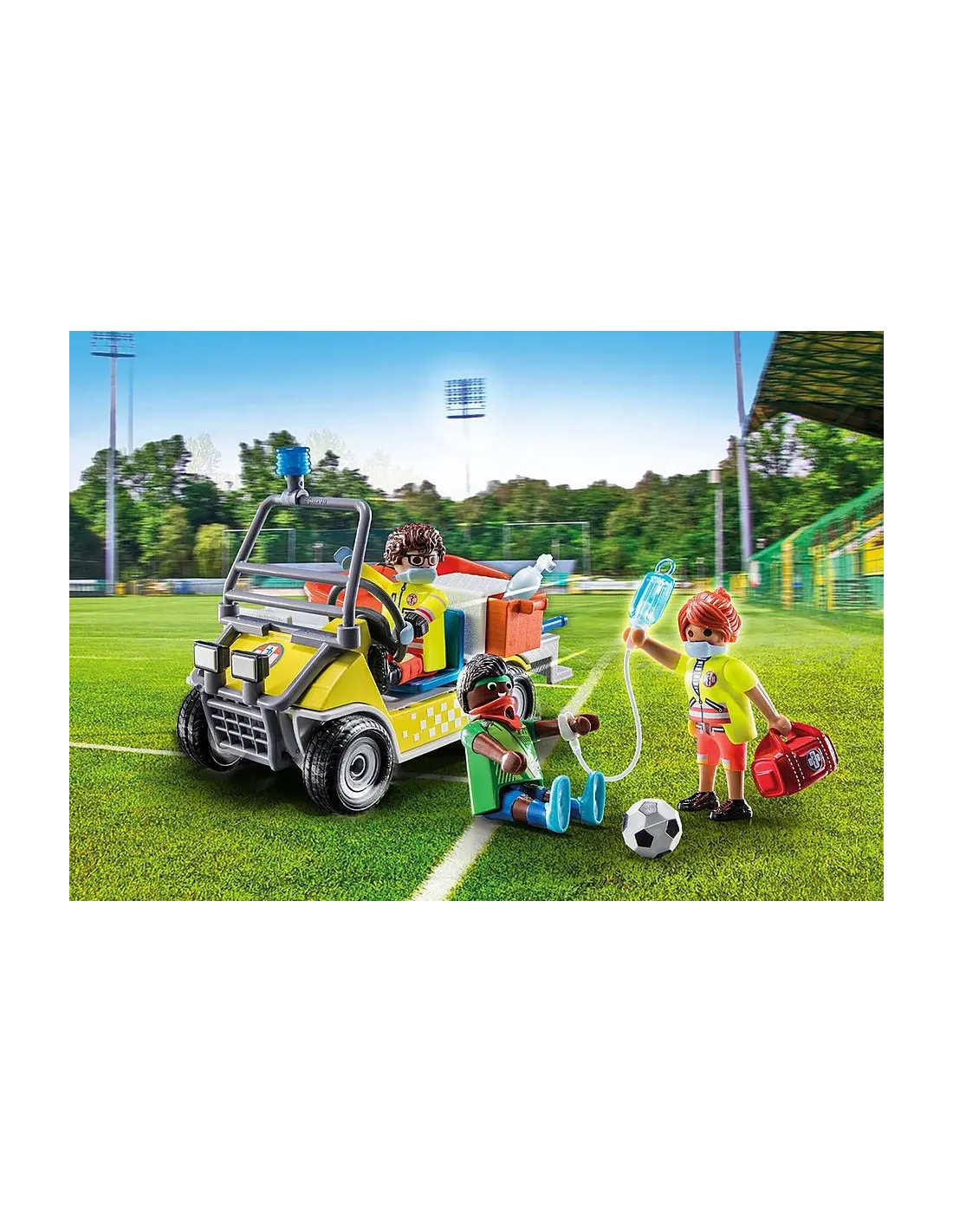 Sube al Coche de Rescate! El coche maniobrable puede llegar al lugar de un accidente en un instante, incluso en terrenos difciles. Esta vez, se ha producido una emergencia en el campo de ftbol. El equipo de rescate se acerca rpidamente al herido. El jugador de ftbol ha sufrido una falta grave y no se puede descartar una lesin en el cuello, por lo que primero se le pone un cors para estabilizarlo. A continuacin, los paramdicos suben con cuidado al jugador a la camilla y rpidamente se dirige al hospital para un examen ms exhaustivo. El set de juguetes contiene 3 figuras PLAYMOBIL, un coche de rescate, una camilla, una bolsa de vendajes, un suero y muchos otros extras para realizar emocionantes misiones de rescate. Los pacientes pueden ser transportados tumbados en la camilla de rescate sobre el carrito. Con las escayolas incluidas, las heridas se curan en un momento. La serie PLAYMOBIL City Life incluye modernos vehculos y modelos realistas para pueden sumergirse en emocionantes juegos de rol