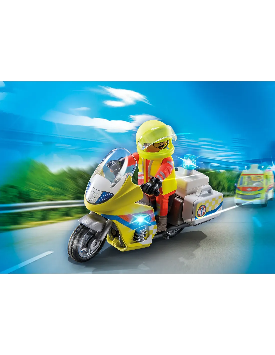 Con la rpida moto de rescate con luz intermitente, el mdico de urgencias llega al lugar del accidente para prestar ayuda. La moto est equipada con una luz intermitente que se puede encender mediante un botn. Para distinguir al mdico entre el trfico de la carretera, el vehculo parpadea no slo en la parte trasera de la maleta de la motocicleta, sino tambin alternativamente en ambos lados. Despus de 60 segundos, la luz se apaga sola. Los accesorios mdicos pueden guardarse y transportarse en el maletn mdico con clip. Se incluyen vendas y bolsas de reanimacin. Un juego de alta calidad a partir de 4 aos. El juego consta de una figura PLAYMOBIL, una moto de rescate, un casco, guantes, una mscara, un maletn de mdico y otros emocionantes extras. Los guantes, el casco y la mscara son desmontables. La serie PLAYMOBIL City Life incluye modernos vehculos y modelos realistas para aprender jugando y desarrollar importantes habilidades