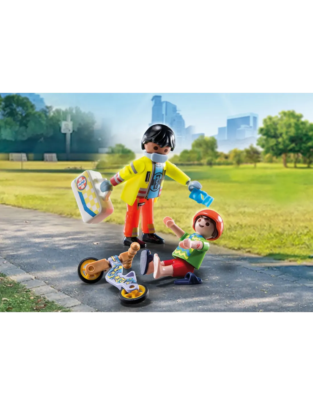 El cuidadoso paramdico siempre est dispuesto a ayudar. Para el tratamiento inicial de las heridas, tiene su botiqun con frulas y muchas vendas. Trata cuidadosamente la herida del nio herido y le aplica una frula en la pierna. El divertido esparadrapo de dinosaurio hace que el pequeo paciente vuelva a sonrer en poco tiempo. Un gran recuerdo o regalo para los pequeos paramdicos. El set de juguete a partir de 4 aos incluye dos figuras PLAYMOBIL, un patinete, un botiqun, frulas de vendaje, un casco y otros extras. Con las escayolas incluidas se pueden curar las heridas. Las "heridas" en el brazo y la pierna de la figura del nio estn hechas de pintura sensible al calor, que desaparecen al frotar y vuelven a ser visibles despus de enfriarse. La mscara bucal, el casco y las zapatillas de bao son desmontables. La serie PLAYMOBIL City Life incluye modernos vehculos y personajes realistas con los que los nios pueden desarrollar importantes habilidades y sumergirse en emocionantes juegos de rol.