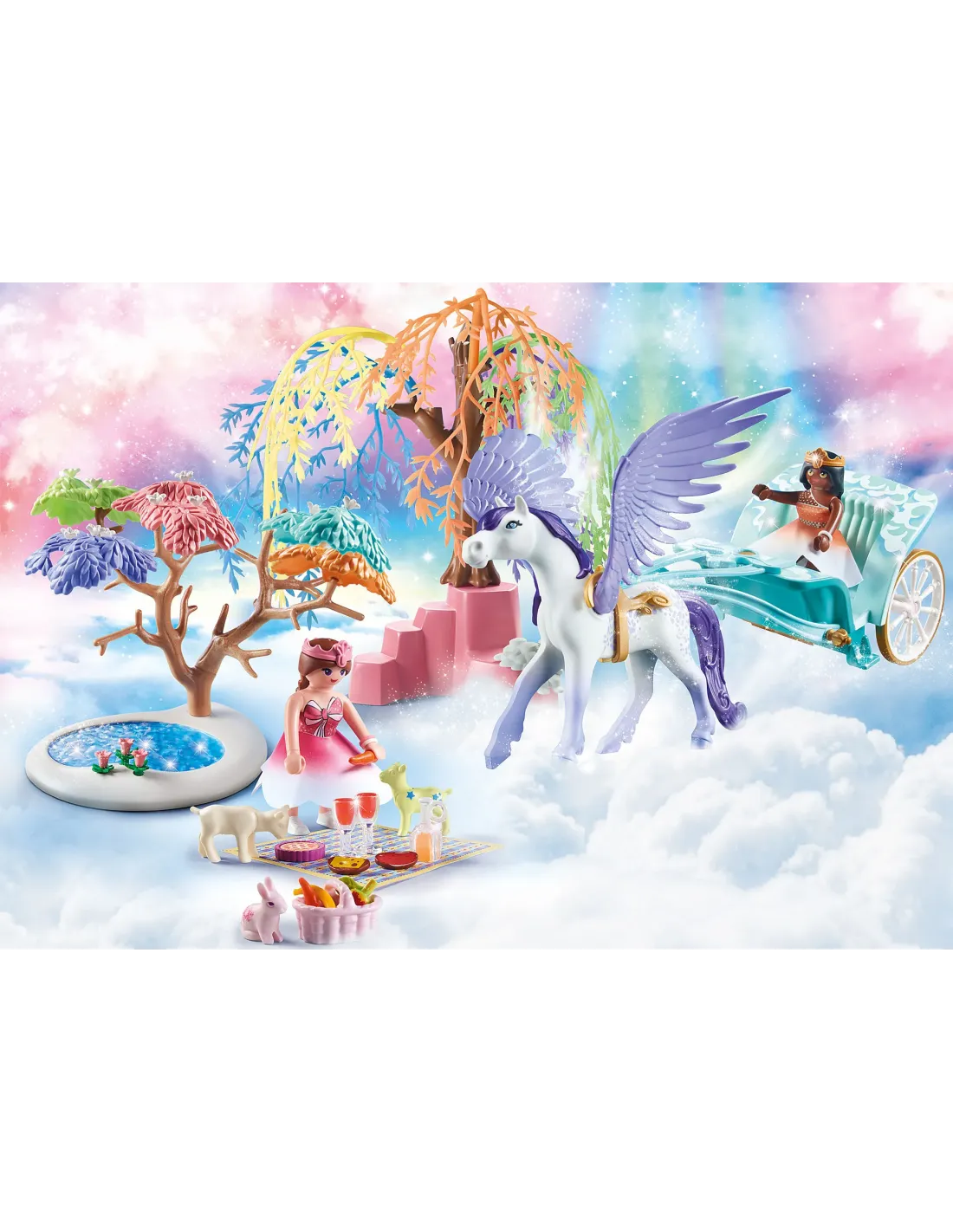 Embrcate en aventuras mgicas con el encantador Picnic de PLAYMOBIL con el set de juego Pegasus Carriage. En su reluciente carruaje Pegaso, las dos princesas realizan una excursin celestial a las nubes. Adems de su amado Pegaso, tienen un conejo y dos lindos nios con ellos como otros animales de compaa. Por supuesto, no debe faltar comida deliciosa para un picnic acogedor. Con torta, frutas y bebidas refrescantes, tu bienestar fsico est bien cuidado.