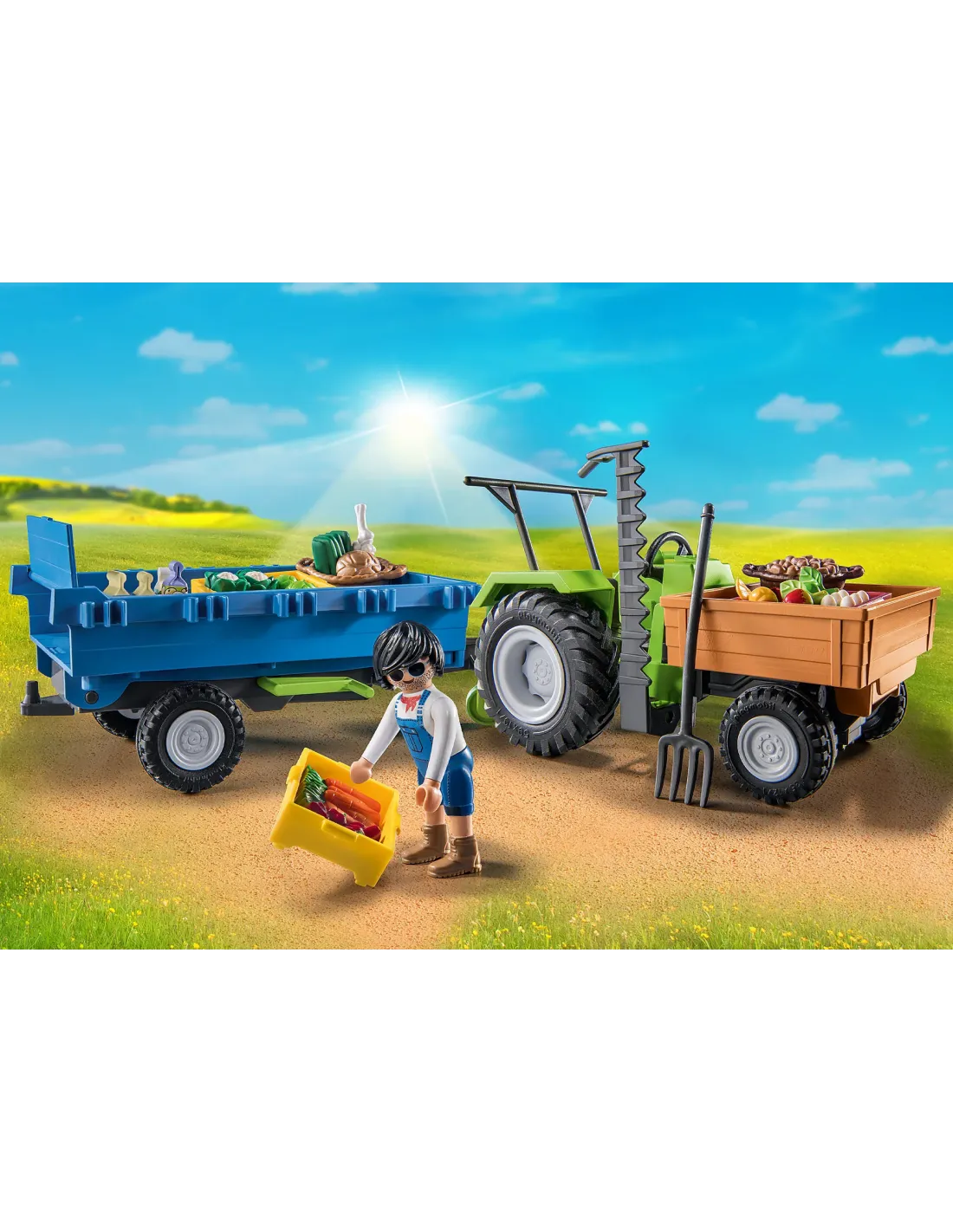 Ayuda al granjero a trabajar en el campo con el Tractor con remolque de PLAYMOBIL. Con accesorios realistas, como la zona de carga y los grandes neumticos, el tractor ofrece una experiencia de juego creativa. Las frutas y verduras son cosechadas frescas del campo y se colocan en las cajas de transporte para transportarlas a la tienda para su venta.