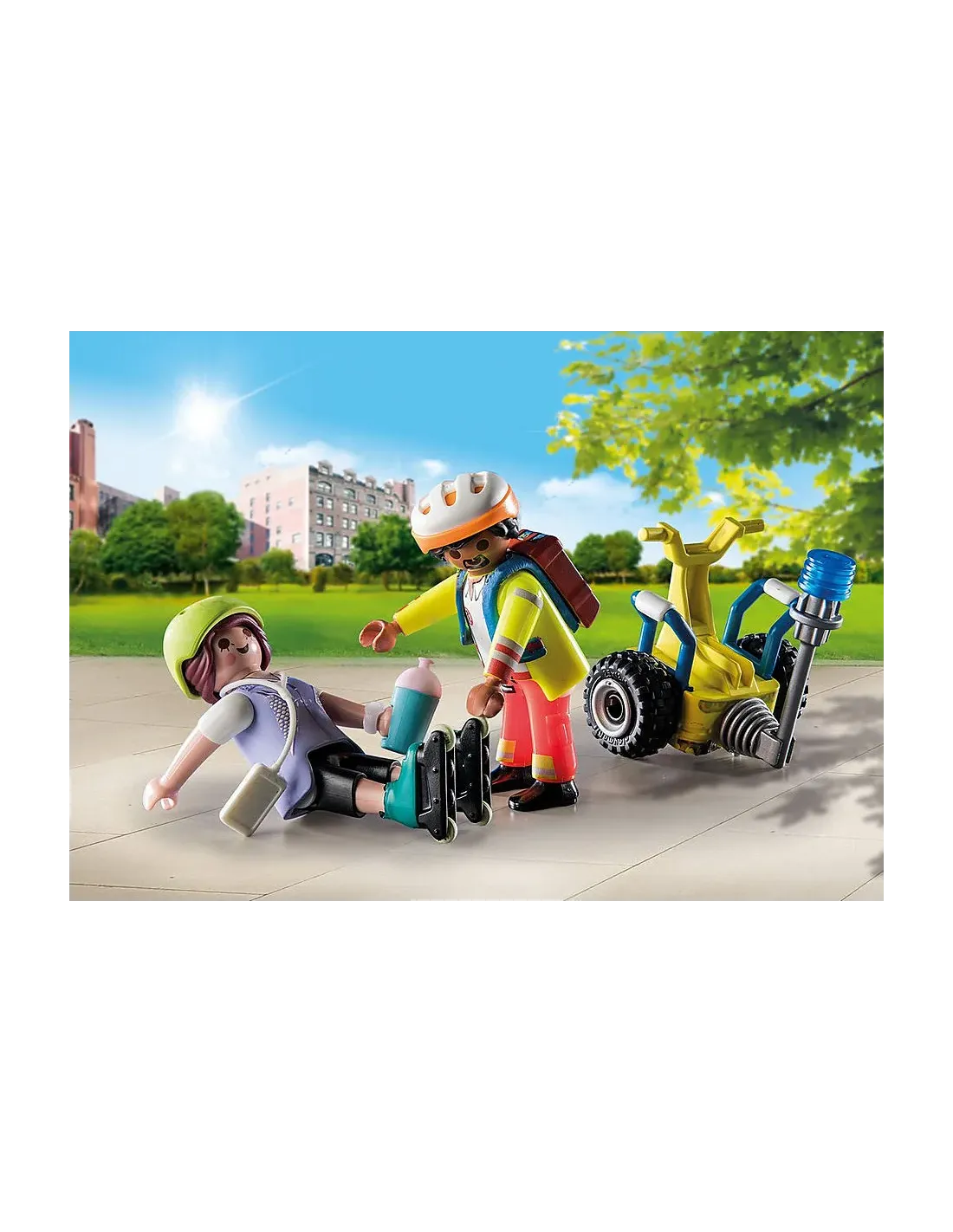 Corre al rescate con el Starter Pack Rescate con Balance Racer de PLAYMOBIL. La patinadora se ha cado en el parque y ya no puede levantarse. Inmediatamente, el paramdico acude al rescate. Gracias a su equilibrio, es capaz de llegar rpidamente a travs del parque. En cuanto llega, se encarga de los primeros auxilios. A continuacin, se dirigen al hospital para un examen ms exhaustivo. Una gran experiencia de juego a partir de 4 aos. El set incluye dos figuras PLAYMOBIL, un Balance Racer, una mochila, patines, reloj de pulsera y otros accesorios para un juego de rol imaginativo. Con las diferentes etiquetas de los vendajes, la figura lesionada puede ser vendada como se desee. Los patines de la figura femenina son desmontables. Los Starter Packs de PLAYMOBIL son la introduccin ideal al universo PLAYMOBIL. Los sets contienen figuras de juego y accesorios para los diferentes mundos de PLAYMOBIL, son rpidos de montar y estn listos para jugar de inmediato.