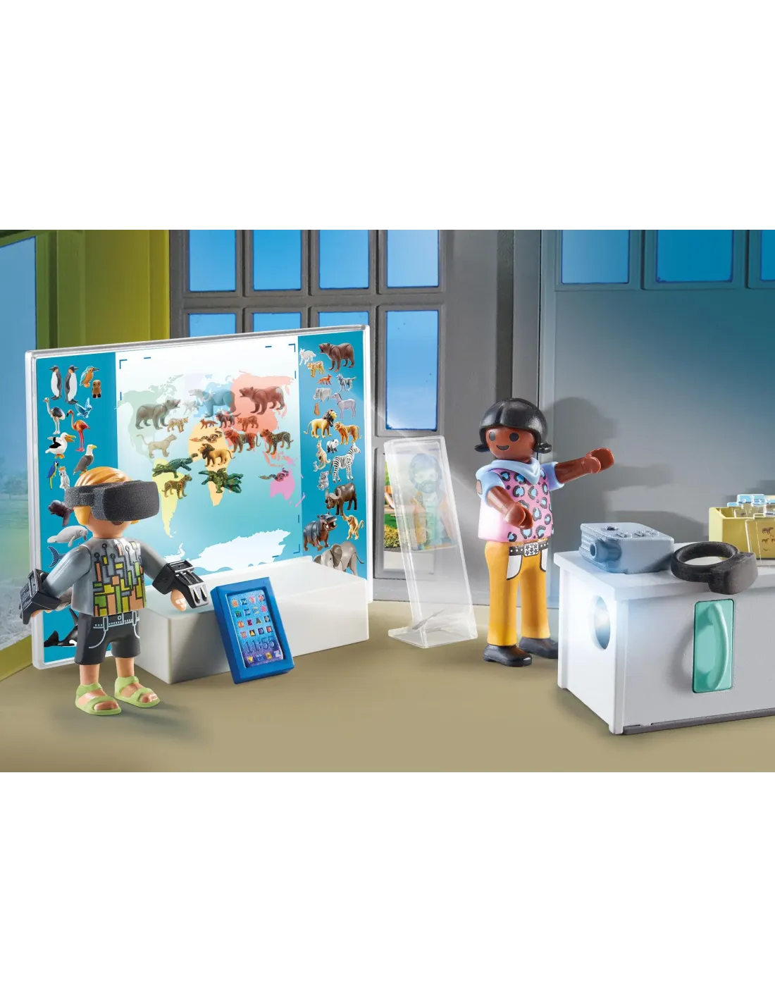 Esta Aula Virtual lo tiene todo. Aquí, los alumnos y alumnas pueden sumergirse en mundos de aprendizaje digital. Con el proyector en funcionamiento, se pueden proyectar grandes imágenes en la pantalla en un instante. Las gafas de RV abren experiencias de aprendizaje completamente nuevas para los alumnos/as, y con la moderna tablet, investigar en Internet es el doble de divertido. El aula virtual es el juego ideal para niños/as curiosos a los que les encanta inventar sus propias historias. El set de juguete viene con dos figuras PLAYMOBIL, un proyector, una pantalla, una tableta, dos pares de gafas VR y otros modernos extras para juegos de rol creativos.