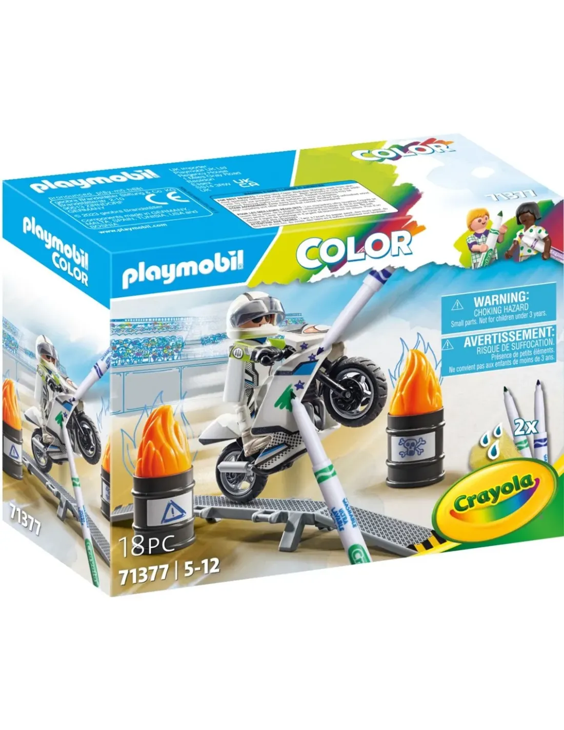 ¡Han vuelto! Después de 45 años, la serie única PLAYMOBIL Color está haciendo su regreso. En colaboración con la creativa compañía CRAYOLA, aparecen cinco nuevos sets con figuras básicas blancas y muchos accesorios que se pueden diseñar individualmente y lavar nuevamente. De esta manera, los niños pueden pintar una y otra vez a sus figuras favoritas. Los sets personalizables de PLAYMOBIL Color fomentan de manera lúdica la creatividad y las habilidades motoras finas de los pequeños fans del bricolaje.Los amantes de las motocicletas pueden emocionarse con una moto que se puede embellecer para el próximo espectáculo acrobático. ¡Un vehículo así es único!