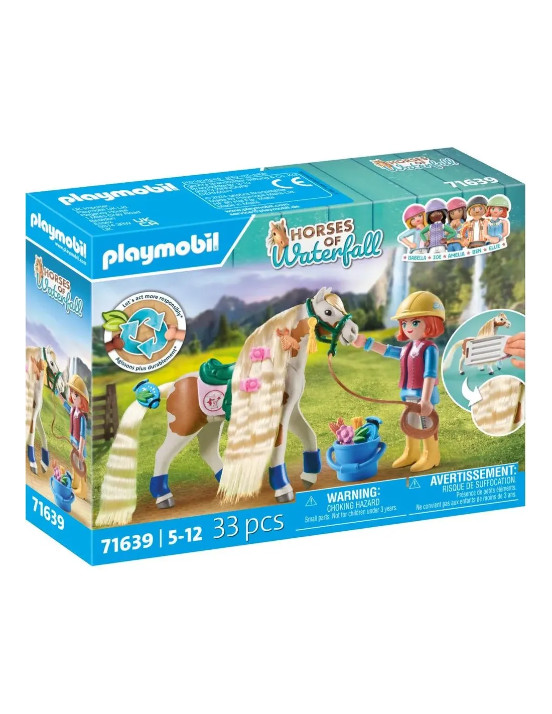 Aventuras con Ellie y su fiel caballo Sawdust. Incluye accesorios para el pelo y plancha de ondas para realizar creativos peinados a caballo.A Ellie le encanta decorar la crin yde su caballo Pinto con bonitos broches. Antes de llevar al caballo a dar un paseo, le espera un momento especial: peinarlo con la plancha de rizar, que también seincluye en el set. Con su crin ondulada, Pinto es la nueva estrella del Rancho Waterfall.Curiosidad: el pelo rizado fue una tendencia de moda en los años 90 y ahora está de vuelta.Todos los sets de juego Horses of Waterfall están fabricados con una media de más del 80% de materiales sostenibles.