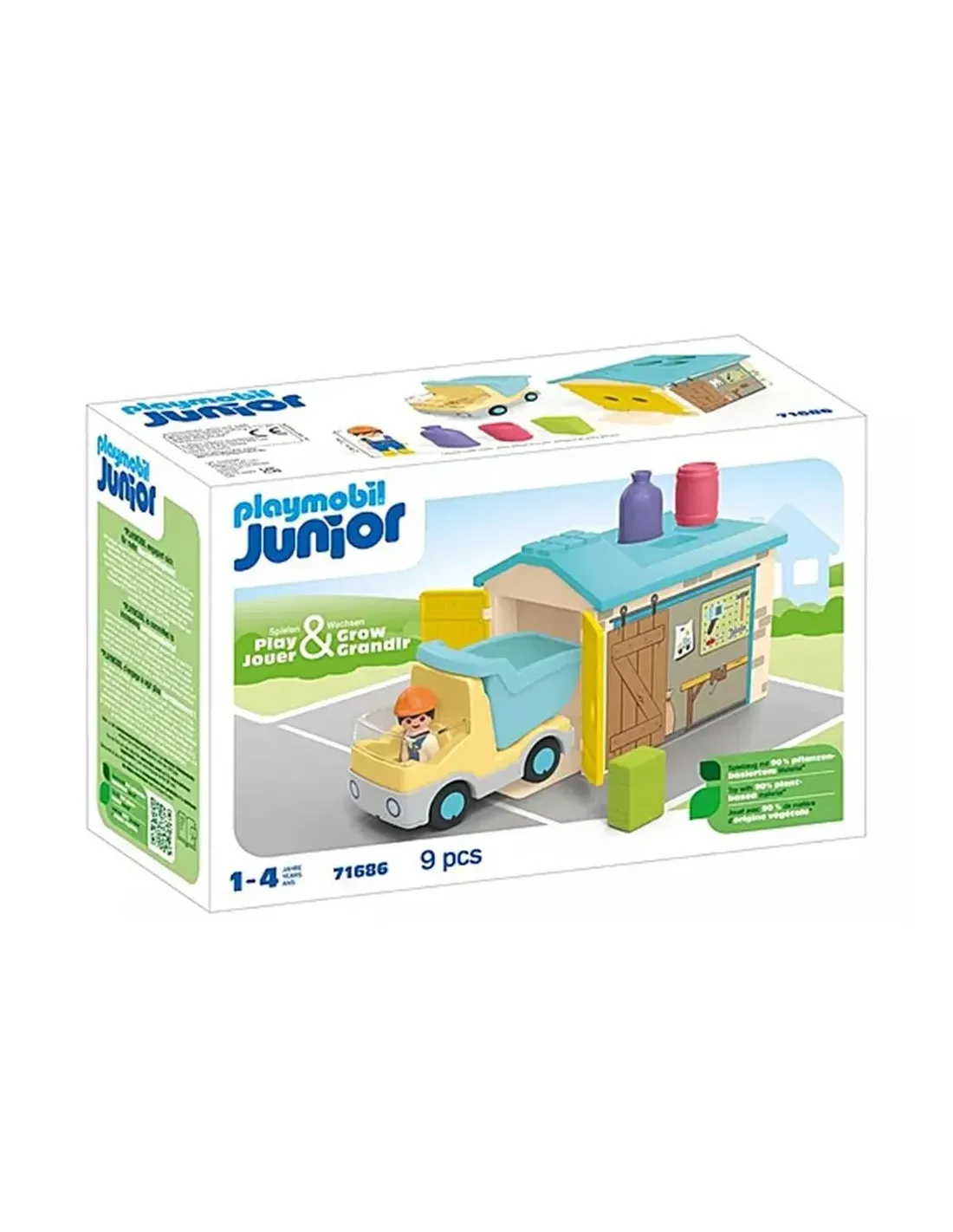 ¡Emocionantes descubrimientos para pequeños constructores! Este set con un camión y un garaje de clasificación ofrece diversión apta para niños y niñas pequeños. El obrero de la construcciónencuentra su sitio en la cabina del conductor. Cuando el niño o niña mete el camión marcha atrás en el garaje, el saco, la caja y el barril encuentran su sitio en la caja a través del hueco correcto. Pero,¿qué forma cabe por cada hueco? ¿Qué elemento cae primero en el volquete? Deje que su hijo lo averigüe. Una vez cargado el camión, se dirige a la obra. Cuando la plataforma se inclina hacia atrás, sepuede descargar la carga. ¿Qué obra le espera hoy al obrero de la construcción? ¡Cread juntos una historia divertida!