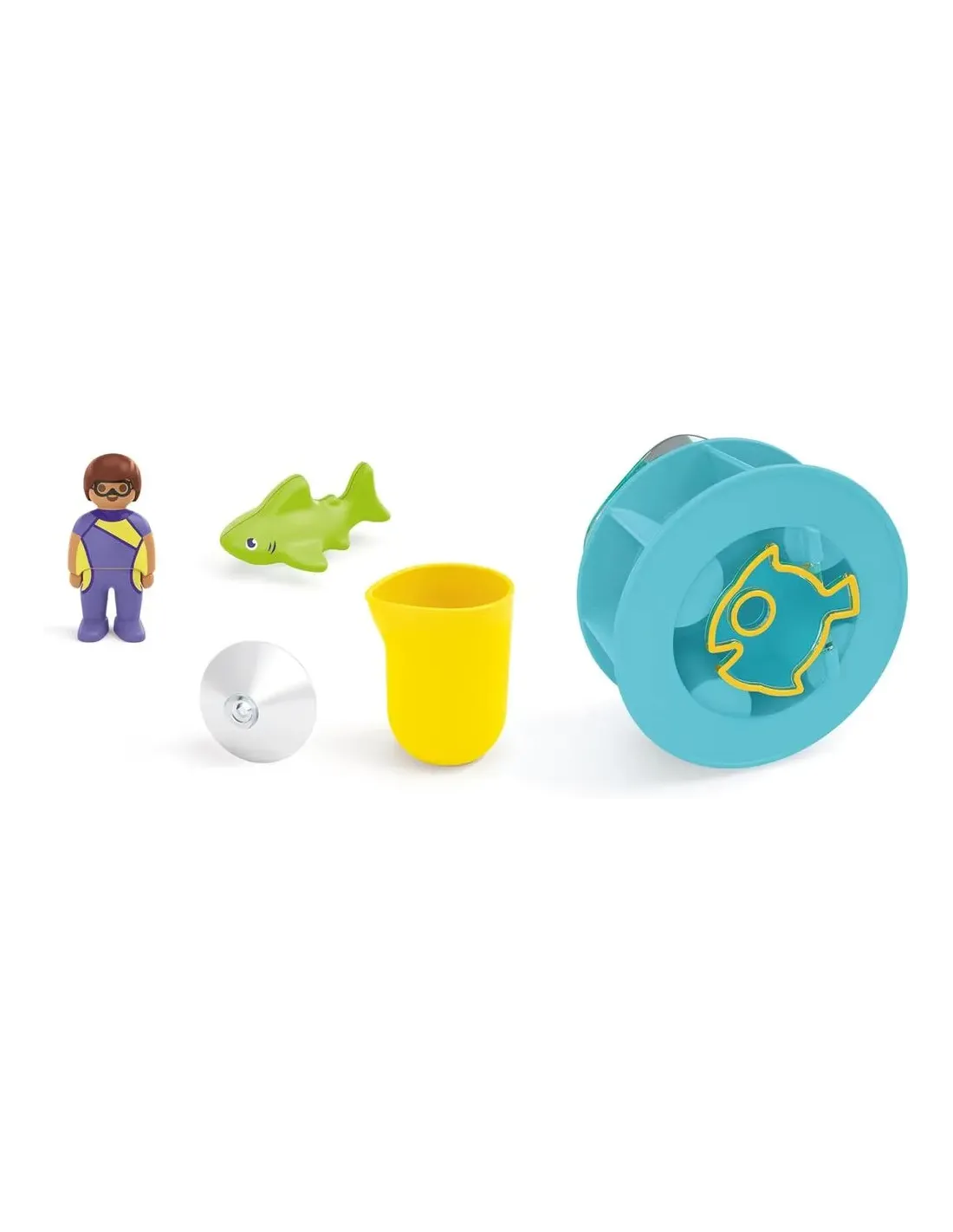 Listo para un divertido paseo en la rueda giratoria de agua? Al verter agua (por ejemplo, con el vaso de agua incluido), la rueda se pone en movimiento y hace girar al buzo o al bebé tiburón.Dimensiones: rueda de agua 13 x 13 x 9 cm (LxPxA). Dimensiones: vaso 7 x 6 x 8,5 cm (LxPxA).Preparado para divertidos juegos acuáticos? Entonces los sets de juego PLAYMOBIL 1.2.3 AQUA son justo lo que necesitas. Con la Rueda de Agua con el Bebé Tiburón la diversión es máxima en labañera. Simplemente fija la rueda de agua con la ventosa al borde de la bañera o al azulejo, introduce la figura y cierra la puerta. Cuando la copa roja se llena de agua y se vierte el agua en las palas de larueda, ésta se pone en movimiento. ¡Comienza el divertido paseo en torbellino! El set incluye una figura PLAYMOBIL 1.2.3, un bebé tiburón, una rueda de agua y un vaso. Los juegos PLAYMOBIL 1.2.3AQUA promueven de forma lúdica la motricidad fina y la comprensión de las relaciones. Con los elementos marcados en rojo, los aficionados al agua descubren las distintas funciones de juego. El bebétiburón puede nadar. La rueda de agua puede combinarse idealmente con el set 70635 Balancín de agua con barco.Contenido: Figuras: 1 buzo, animal: 1 bebé tiburón, Accesorios: 1 rueda de agua con ventosa, 1 taza de agua.