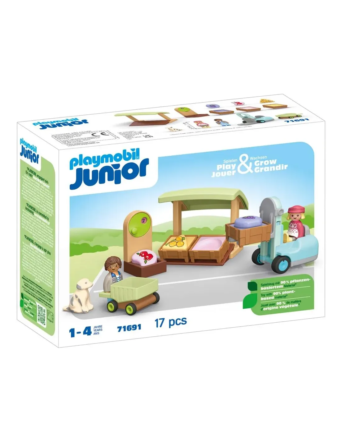 ¡Es día de mercado! ¿Qué vendedor tiene las verduras más crujientes y las frutas más dulces? Con este colorido set, tu hijo puede adquirir sus primeras experiencias de compra. ¿Quién entrega loscomestibles y cómo se pesan? Con el Puesto de Mercado Orgánico, tu hijo puede recrear de forma lúdica el proceso de compra y, en el proceso, desarrollar un sentido de las formas, los colores y lascantidades. ¿A tu hijo le gusta ir de compras? Entonces este set es perfecto para ti. En el Puesto de Mercado Orgánico, hay mucho para que los pequeños visitantes del mercado exploren. La carretillaelevadora entrega frutas y verduras. Rápidamente, se descargan las cajas y comienzan las ventas. ¿Cuántos plátanos están impresos en el bloque de formas? ¿Quién puede girar la báscula hasta elnúmero correcto? ¿Y cuántas frutas caben en el carrito de la compra? ¿Quién puede clasificar todas las frutas y verduras en la caja correcta? Después de la exitosa visita de compras, todavía queda unapregunta: ¿Qué fruta o verdura sabe mejor?Características especiales del producto:El carrito de compras puede ser empujado por la figuraTres cajas apilables con bloques de formas a juego para clasificar por color y formaTres bloques de formas impresos con seis frutas y verduras diferentes para aprender cantidades básicas.Puesto de mercado con zona de venta de las cajasCarretilla elevadora con horquilla regulable en altura para facilitar la carga y descarga.Escala con rueda giratoria para ajustar el bloque de forma adecuadoPLAYMOBIL JUNIOR: ¡diseñado para los fans más jóvenes de PLAYMOBIL! Perfecto para manos pequeñas y para los primeros descubrimientos de los niños pequeños. Con muchas funcionesemocionantes, como apilar, armar rompecabezas o clasificar. Deja que tu hijo de entre 1 y 4 años dé sus primeros pasos en el gran mundo de PLAYMOBIL con PLAYMOBIL¡JÚNIOR!PLAYMOBIL JUNIOR tiene en cuenta la seguridad de tu hijo: PLAYMOBIL JUNIOR está fabricado en la UE, libre de BPA y diseñado sin piezas pequeñas que puedan suponer un riesgo de ingestión.Además, todos los juegos de PLAYMOBIL JUNIOR están fabricados con más del 90 % de plásticos de origen vegetal, que pueden atribuirse a materiales sobrantes de la producción de alimentos o papelmediante el enfoque de balance de masas utilizado en la economía circular y de acuerdo con la norma ISCC-208. Estos plásticos son tan resistentes y fáciles de cuidar como siempre.Para el embalaje de nuestro PLAYMOBIL JUNIOR utilizamos al menos un 90% de cartón reciclado y un 100% de papel reciclado y, siempre que es posible, evitamos el plástico.PLAYMOBIL JUNIOR: ¡descubre el mundo de una forma adaptada a los más pequeños!