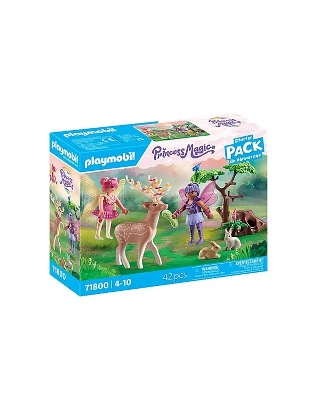 - ESPECIFICACIONES DEL PRODUCTONúmero de artículo: 71800Dimensiones del envase: 24.8 x 18.7 x 7.2 cmDimensiones del producto: 37.7 x 19.7 x 26.0 cmPeso: 206 gEdad recomendada: A partir de 4 años- DESCRIPCIÓNDescubre la magia del bosque con el Starter Pack Hadas con animales del bosque de PLAYMOBIL. Dos hadas encantadoras cuidan con ternura de los animales, adornando la cornamenta del ciervo con flores de colores y alimentando a sus amigos del bosque. Los conejos curiosos y los pájaros vivaces completan este mágico escenario, perfecto para estimular la creatividad de los más pequeños.Con alas extraíbles y múltiples accesorios, este set ofrece infinitas posibilidades de juego, promoviendo la imaginación, el amor por la naturaleza y la creación de historias llenas de fantasía. Cada detalle, desde las flores hasta los troncos y árboles, enriquece las aventuras en este bosque encantado.- CARACTERÍSTICAS PRINCIPALESComparte la magia con las hadas Crea historias encantadoras entre hadas y animales, donde cada accesorio se convierte en una nueva oportunidad de juego.Decora la cornamenta y admira el bosque Las flores de colores realzan la belleza de los ciervos, mientras los animales con cabezas móviles hacen más realista la experiencia.Invita a amigos y amigas a vivir aventuras mágicas Comparte el juego y descubre secretos en cada rincón del bosque, fortaleciendo valores como la amistad y el cuidado de la naturaleza.Escenarios llenos de vida Incluye elementos naturales como troncos, árboles y plantas para ambientar cada historia de forma creativa.Accesorios versátiles Con alas extraíbles, flores decorativas y comederos, este set ofrece múltiples formas de interactuar con el entorno.- INSTRUCCIONES DE MONTAJEIncluye instrucciones claras para un montaje sencillo.- CONTENIDOFiguras: 2 hadasAnimales: 2 conejos, 1 ciervo, 2 pájarosAccesorios:2 lazos para el pelo 1 cinta para el pelo 2 collares de alas 2 pares de alas de hada 2 brazaletes 12 flores 1 cesta 2 haces de heno 1 nabo 1 planta verde con flor 1 tocón de árbol 1 árbol
