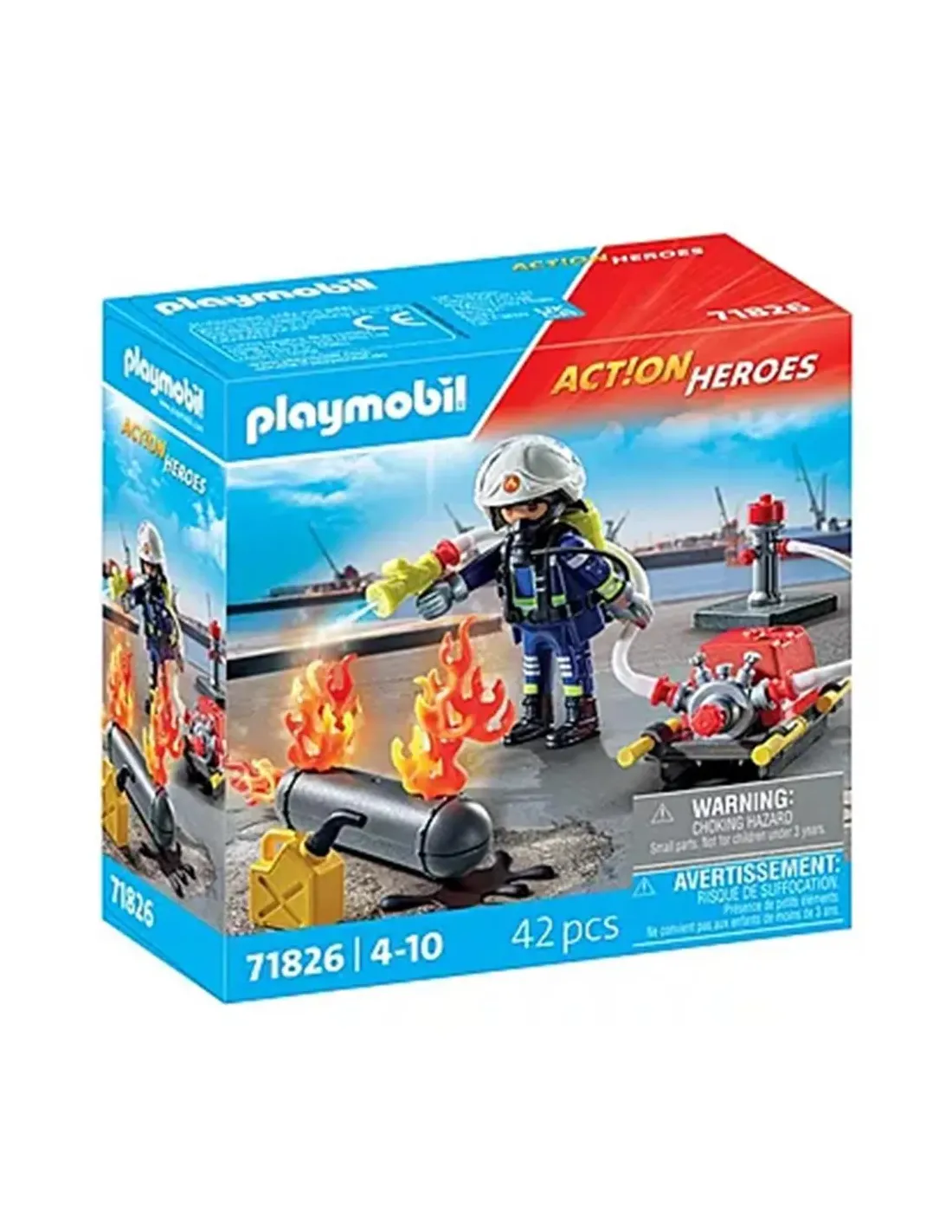 -NÚMERO DE ARTÍCULO71826-DIMENSIONES DEL PRODUCTO34.4 x 14.9 x 15.4 cm-DIMENSIONES DEL ENVASE14.2 x 14.2 x 6.6 cm-PESO147 g-MATERIALPlástico resistente-EDAD RECOMENDADAA partir de 4 años-CARACTERÍSTICAS PRINCIPALESFigura de bombero equipada con casco y guantes desmontablesIncluye una bomba de agua funcional que se conecta a la boca de incendiosMangueras de agua desmontables para dirigir el chorro hacia las llamasLlamas reposicionables y mancha de aceite para crear diferentes escenas de incendioBase transparente para simular la escena del incendio-EXPERIENCIA DE JUEGOPermite recrear situaciones de emergencia y apagar incendios antes de que se propaguenEstimula la creatividad y el juego de rol con aventuras de rescateOfrece una experiencia interactiva conectando las mangueras a la bomba y apuntando hacia las llamas-CONTENIDO DEL SETFiguras: 1 hombre con casco de bombero y 2 guantesAccesorios: 1 depósito de gas, 4 llamas, 1 mancha de aceite, 1 base transparente, 2 mangueras de agua, 1 accesorio para manguera de agua, 1 bomba de agua, 1 bidón de aceite, 1 boca de incendios con placa base-INSTRUCCIONES DE MONTAJEIncluidas en el paquete