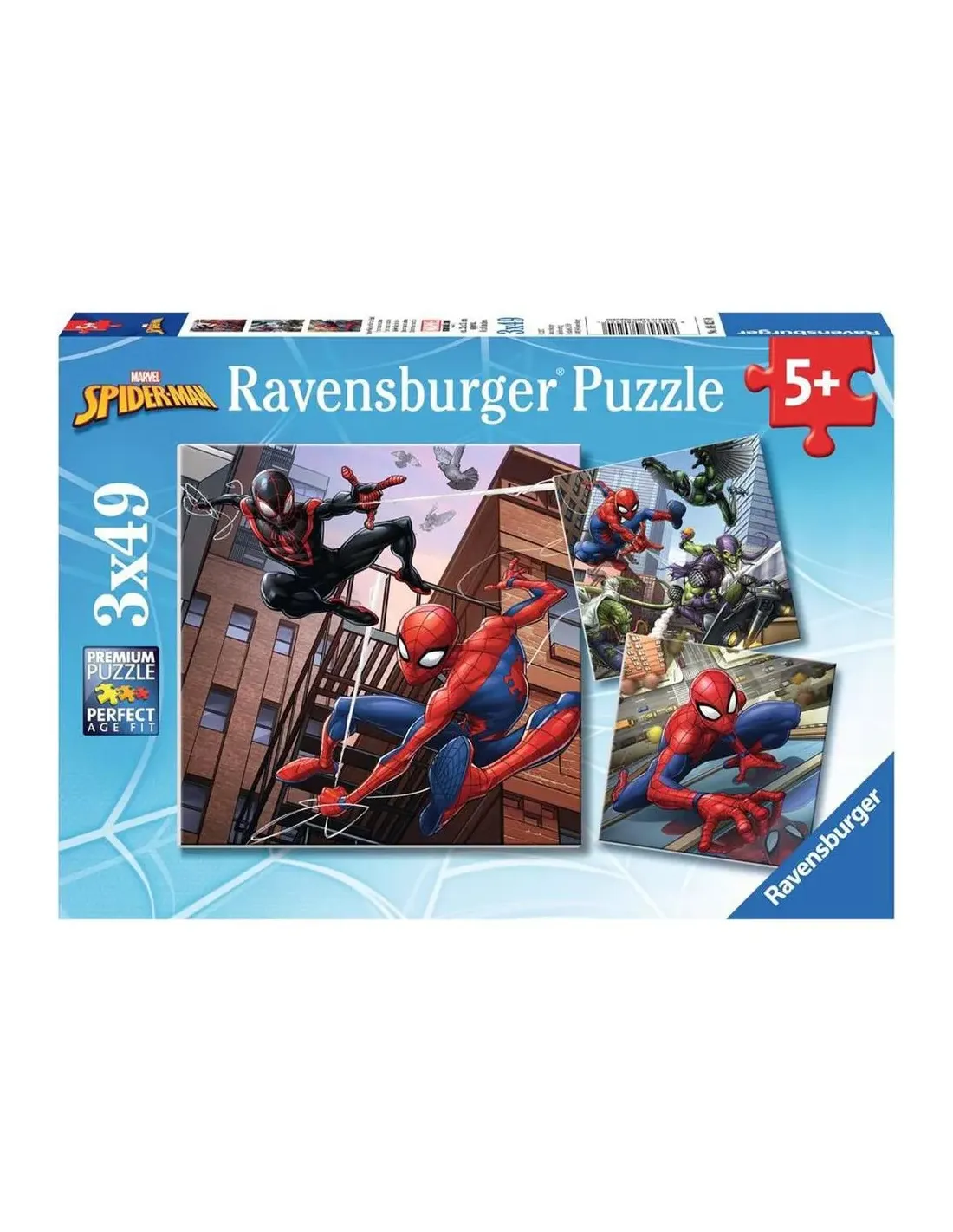 Ravensburger - Puzzle Spiderman, Colección 3 x 49, 3 Puzzle de 49 Piezas, Puzzle para Niños, Edad Recomendada 5+ AñosMás información sobre el producto¿Por qué elegir un puzzle Ravensburger para tus hijos? Desde hace generaciones, acompañamos a millones de personas en su crecimiento y su vida cotidiana. Combinamos la calidad con la atención aldetalle, garantizando a todas las familias una diversión y satisfacción incomparables.Cuidamos meticulosamente cada etapa de la producción: la calidad y la seguridad son nuestras prioridades. Nuestros puzzles están fabricados con cartón reciclado y cortados con troqueles hechos a manopara garantizar un ajuste perfecto y un resultado impecable en todo momento. Los puzzles Ravensburger estimulan la motricidad fina, mejoran la coordinación mano-ojo y ejercitan la concentración y lapaciencia, enseñando a los niños pequeños a resolver problemas con un enfoque estratégico y estructurado. Ofrecemos una amplia gama de imágenes que se adaptan a todos los gustos de los niños y,gracias a la tecnología Soft-Click, cada pieza del puzzle encaja perfectamente para garantizar un rendimiento uniforme e impecable.Regala a tu niño o niña diversión y relajación con uno de nuestros puzles. ¡Descubre un nuevo mundo de diversión con nosotrosBuscar las piezas, unirlas y alegrarse a medida que la imagen va creciendo: hacer un puzle es vivir un logro con cada pieza añadida. Por eso a los niños les encantan montar las piezas de puzle para componersus motivos favoritos. Pero los puzles no solo les ofrecen momentos de diversión: si se escoge el nivel de dificultad adecuado, los niños de cualquier edad pueden crecer afrontando el reto que suponercomponer el puzle, aumentan su paciencia y refuerzan su confianza. Con la amplia selección de puzles infantiles de Ravensburger con los motivos más populares, desde 2 hasta 300 piezas, se garantiza quecada niño encuentre su puzle ideal. Prestamos especial atención a la selección de los motivos y la alta calidad de nuestros puzles infantiles. Por eso, un instituto independiente certifica la inocuidad de todos losmateriales utilizados.Llevamos más de 100 años desarrollando puzles tal y como les gustan a los niños: con los motivos, el número de piezas y el tamaño adecuados para su edad.contenidoPiezas de puzzleEAN: 4005556080250licencia: Spider-ManAdvertencia. No conviene para niños menores de 36 meses. Partes pequeñas. Peligro de atragantamiento.