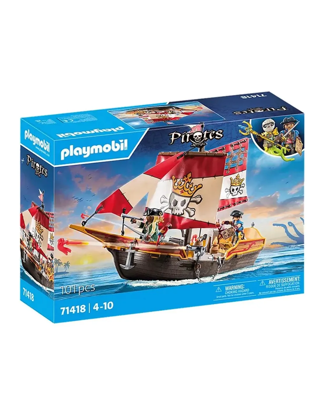 ¡La aventura pirata te espera! En el barco de la Reina Pirata, la tripulación ataca a los barcos enemigos. Gracias a los cañones giratorios y pivotantes, los atacantes huyen rápidamente. Ahora, el camino estádespejado para buscar tesoros piratas perdidos con el mapa y la brújula...¡Zarpa y emprende una aventura en alta mar con la Reina Pirata y su tripulación! Emocionantes aventuras piratas esperan a los fanáticos y fanáticas de los piratas con el Barco Pirata de PLAYMOBIL. El setincluye un barco pirata con velas móviles, cañones giratorios, dos figuras PLAYMOBIL, un loro, un ancla y muchos accesorios geniales. El barco flota y se puede añadir el motor submarino (7350 - se vende porseparado). Cinco abrazaderas en la cubierta aseguran una posición segura para las figuras. Con personajes imaginativos y equipamiento detallado, los juegos de la línea de Piratas de PLAYMOBIL ofrecenhoras de diversión para niños y niñas de 4 años en adelante.