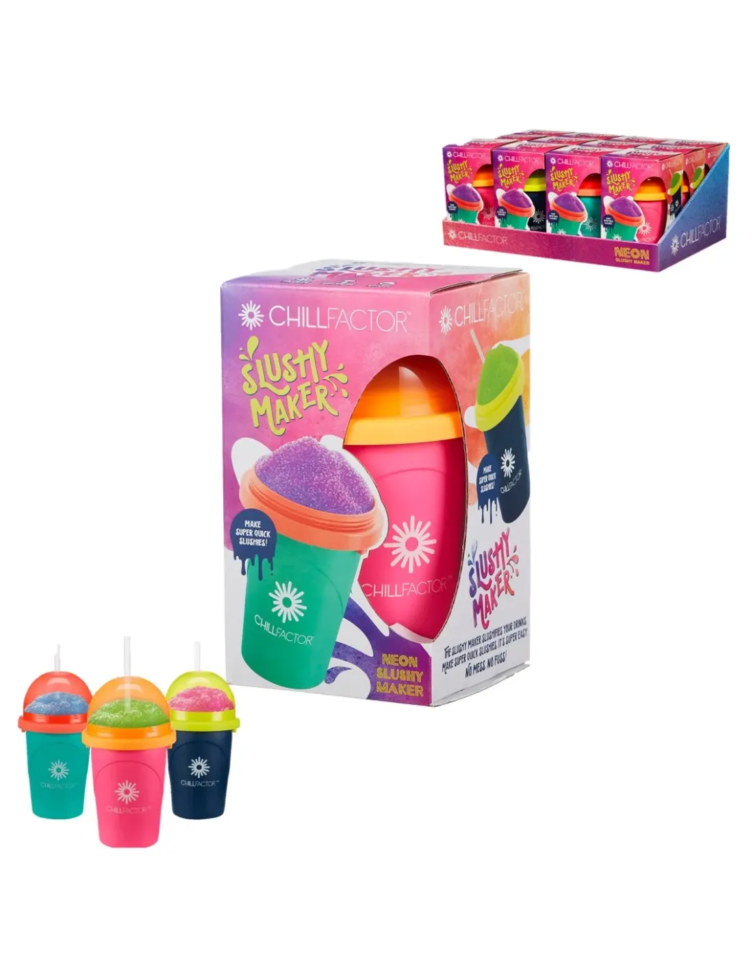 Peques que aman los granizados Y TENER UNA BEBIDA HELADA A TODAS HORAS, deberían poder hacer los suyos propios, utilizando los ingredientes que quieran, cuando quieranChillFactor es tu maquina de granizado sencillamente asombrosa y sorprendentemente sencillo. Solo tienes que congelar, apretar y disfrutar. La puedes encontrar en varios colores diferentes rosa, verdey azul y muchos más. ¡Coleccionalas todas!Se vende 1 unidad aleatoria.