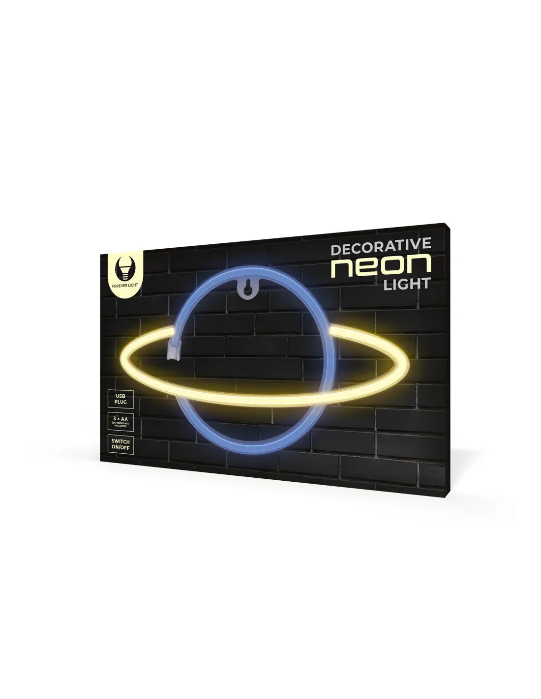 Forever Light Neon LED Saturn Yellow BlueLos neones LED de Forever Light ofrecen un efecto de resplandor colorido que transformará cualquier espacioSon ideales como decoración para estanterías en el salón o como iluminación decorativaSu soporte para neones permite colgarlos fácilmente en superficies verticales, añadiendo un toque moderno y vibrante a tu entorno.Estas luces de neón son la elección perfecta para restaurantes, bares y otros espacios, donde sus colores resaltarán de manera únicaLa característica distintiva de estas luces es su dispersión uniforme de la luz, sin puntos de luz perceptibles.Gracias a la tecnología LED, los neones consumen relativamente poca electricidad y ofrecen una iluminación eficiente.Pueden alimentarse con 3 pilas AA o mediante un enchufe USB, brindándote versatilidad en su uso.Están disponibles en una gran variedad de formas y colores, como blanco, naranja, verde, rojo y rosa, con el cuerpo del aparato en plástico blanco.Las dimensiones varían según el diseño seleccionadoCaracterísticas del Producto:Tecnología LED eficiente.Soporte para colgar en la pared, facilitando la instalación.Patrones de moda que añaden estilo a cualquier espacio.Funciona con 3 pilas AA o mediante enchufe USB para mayor comodidad.Disponible en diversos colores de luz, según el modelo elegido.¡Transforma tu espacio con estas llamativas luces de neón y dale vida a tu entorno con estilo y modernidad!Características Técnicas:Peso bruto (incluido el embalaje): 260 gAltura: 17,50 cmAncho: 30 cmProfundidad: 2,50 cmPeso neto: 187 gramosAltura del embalaje: 19 cmAncho del embalaje: 30 cmProfundidad del embalaje: 2,30 cmTipo de embalaje: cajaColor amarillo/azulTipo de diodo: LEDInterruptor encendido/apagadoDimensiones (mm) L.xP.xA.: 190 x 23 x 308 mmLongitud del cable: 2 mAlimentación: 3 x pila AAUSB: 5V = 1A o 3xAA 1,5V (pilas no incluidas)Tensión de entrada: 5V 1A (USB) o 4.5V 3xAA 1.5VMaterial: PS + PVCEl conjunto incluye: neón LED, guia de usuario