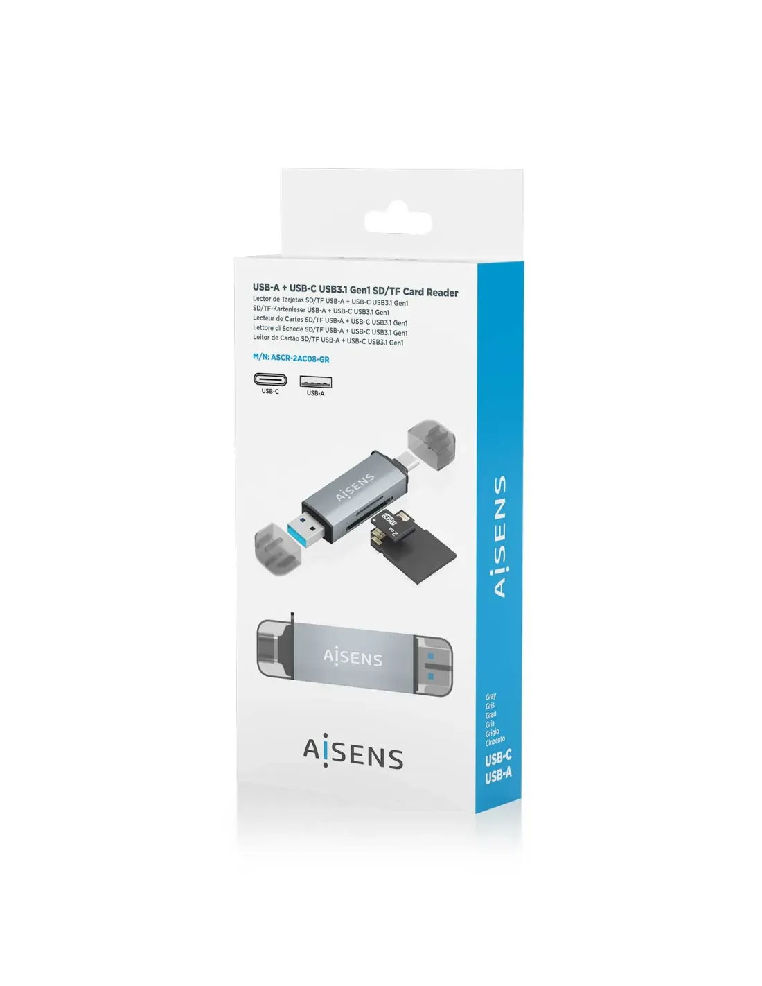 AISENS Lector de Tarjetas SD, Micro SD, MMC, RS-MMC, MMC Micro, USB-A y USB-C, Gris, MMC, MMCmicro, MicroSD (TransFlash), RS-MMC, SD, Gris, RoHS, CE, USB 3.2 Gen 1 (3.1 Gen 1) Type-A/Type-C, 20 mm, 77 mm